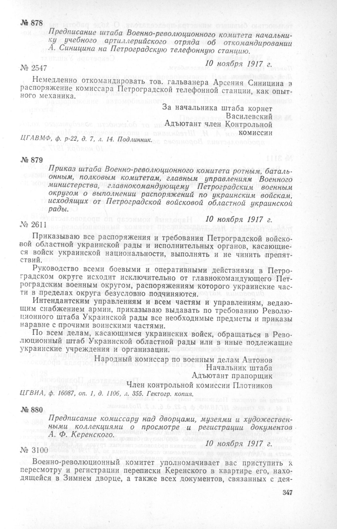 Предписание штаба Военно-революционного комитета начальнику учебного артиллерийского отряда об откомандировании А. Синицина на Петроградскую телефонную станцию. 10 ноября 1917 г. // ЦГАВМФ, ф. р-22, д. 7, л. 14. Подлинник.