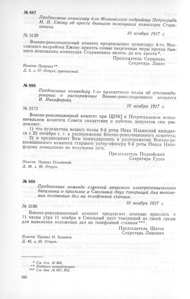 Предписание комиссару 4-го Московского подрайона Петрограда М. Н. Ежову об аресте бывшего помощника комиссара Стариковича. 10 ноября 1917 г. // Д. 5, л. 77. Отпуск, рукописный.