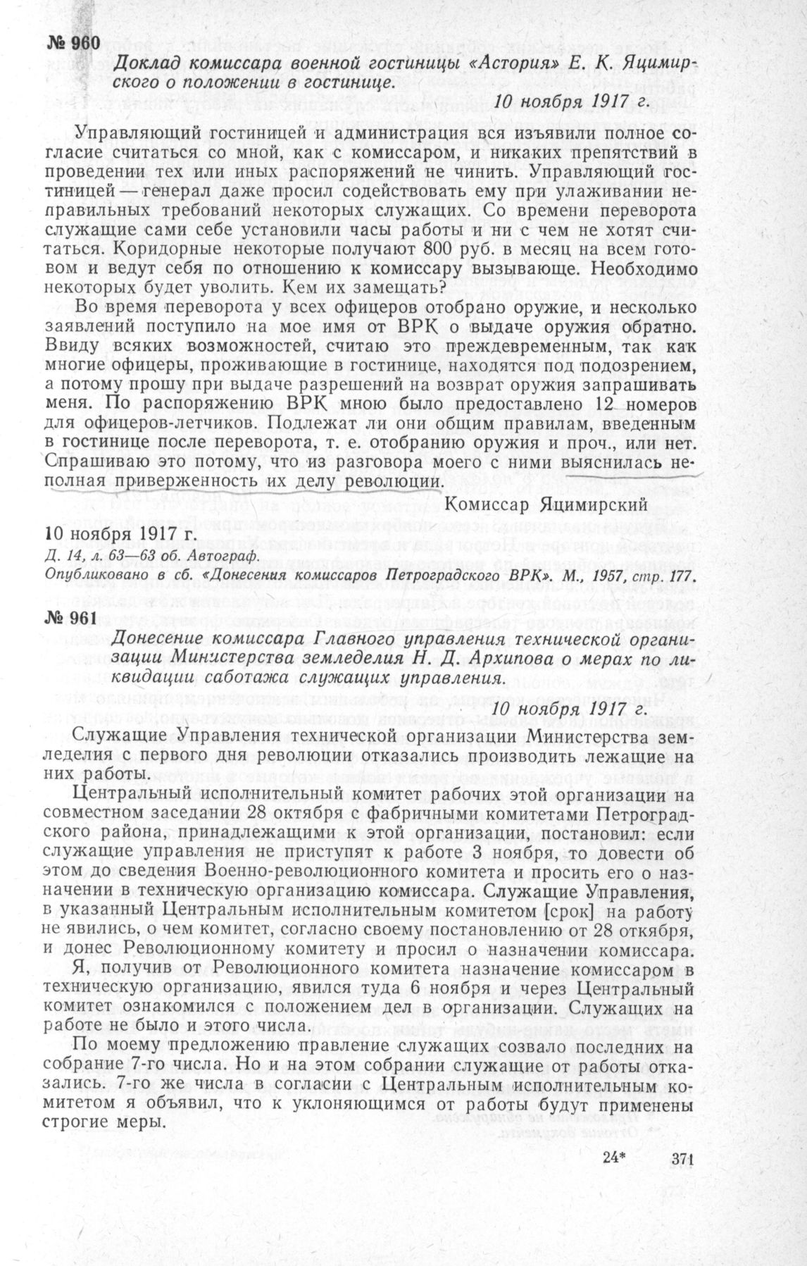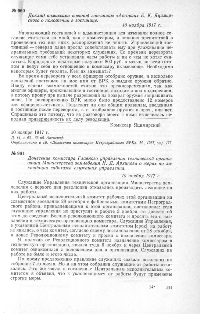 Доклад комиссара военной гостиницы «Астория» Е. К. Яцимирского о положении в гостинице. 10 ноября 1917 г. // Д. 14, л. 63—63 об. Автограф. Опубликовано в сб. «Донесения комиссаров Петроградского ВРК». М., 1957, стр. 177.