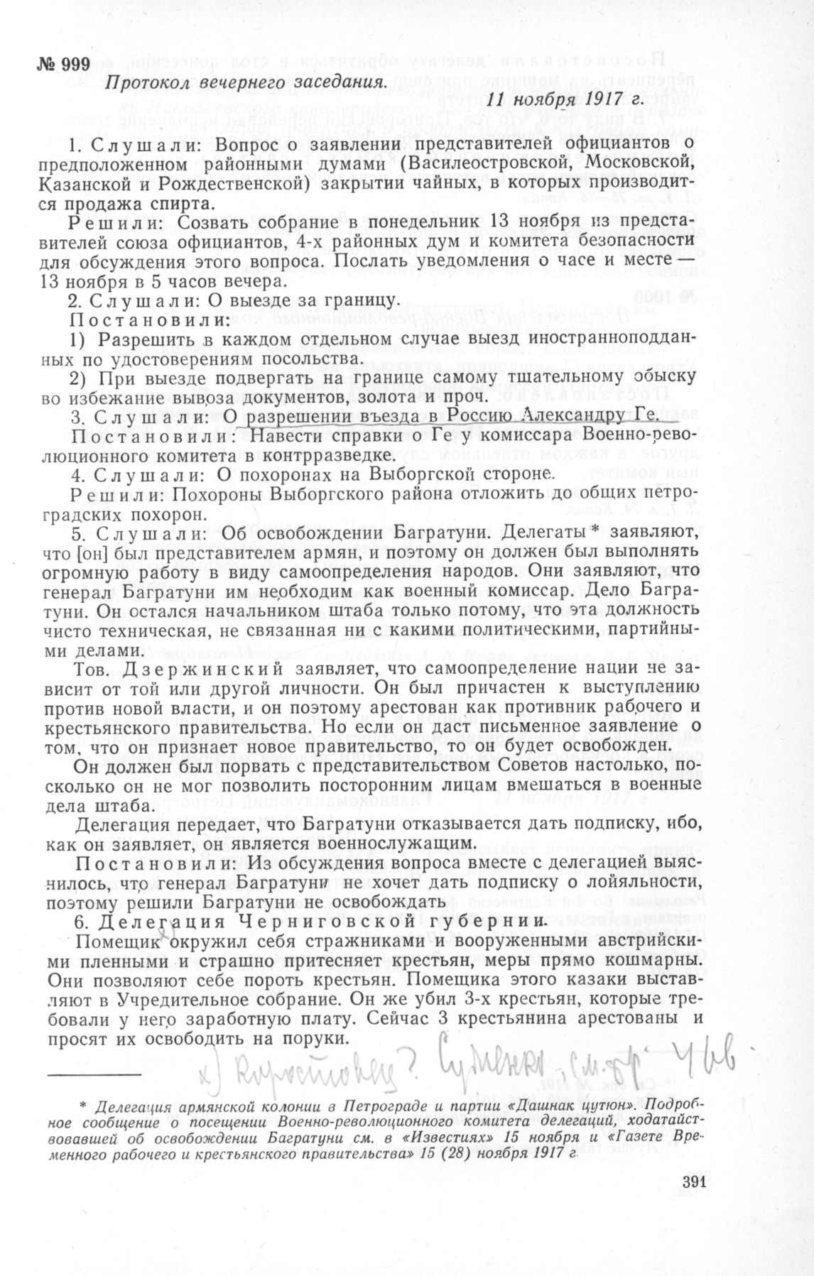 Протокол вечернего заседания. 11 ноября 1917 г. // Д. 1, лл. 75—76. Копия. Опубликовано частично в сб. «Документы Великой пролетарской революции». М., 1938, т. 1, стр. 229—230.
