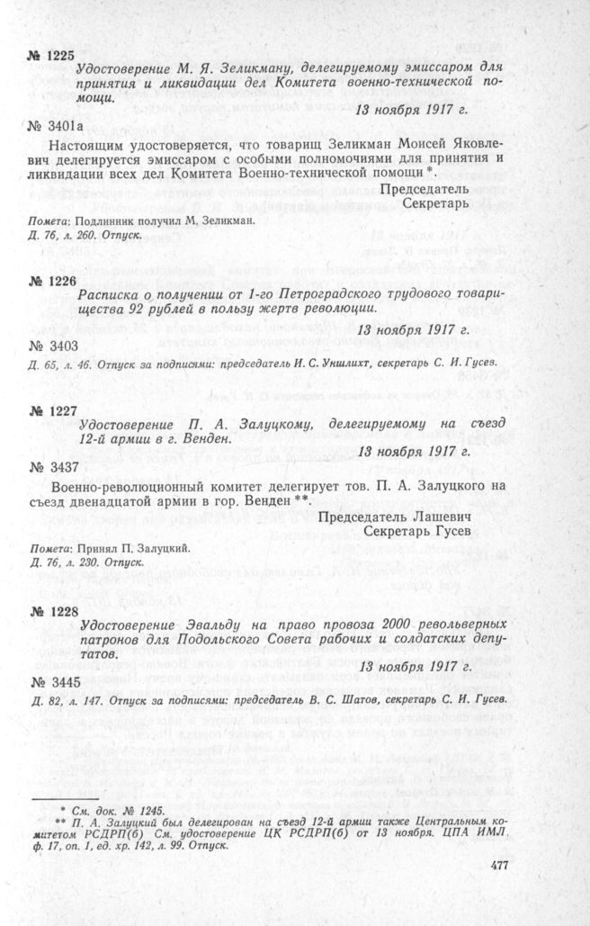 Удостоверение М. Я. Зеликману, делегируемому эмиссаром для принятия и ликвидации дел Комитета военно-технической помощи. 13 ноября 1917 г.