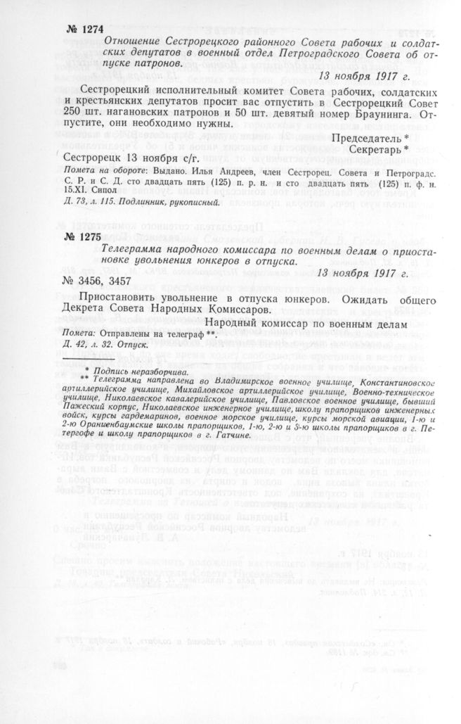 Отношение Сестрорецкого районного Совета рабочих и солдатских депутатов в военный отдел Петроградского Совета об отпуске патронов. 13 ноября 1917 г.