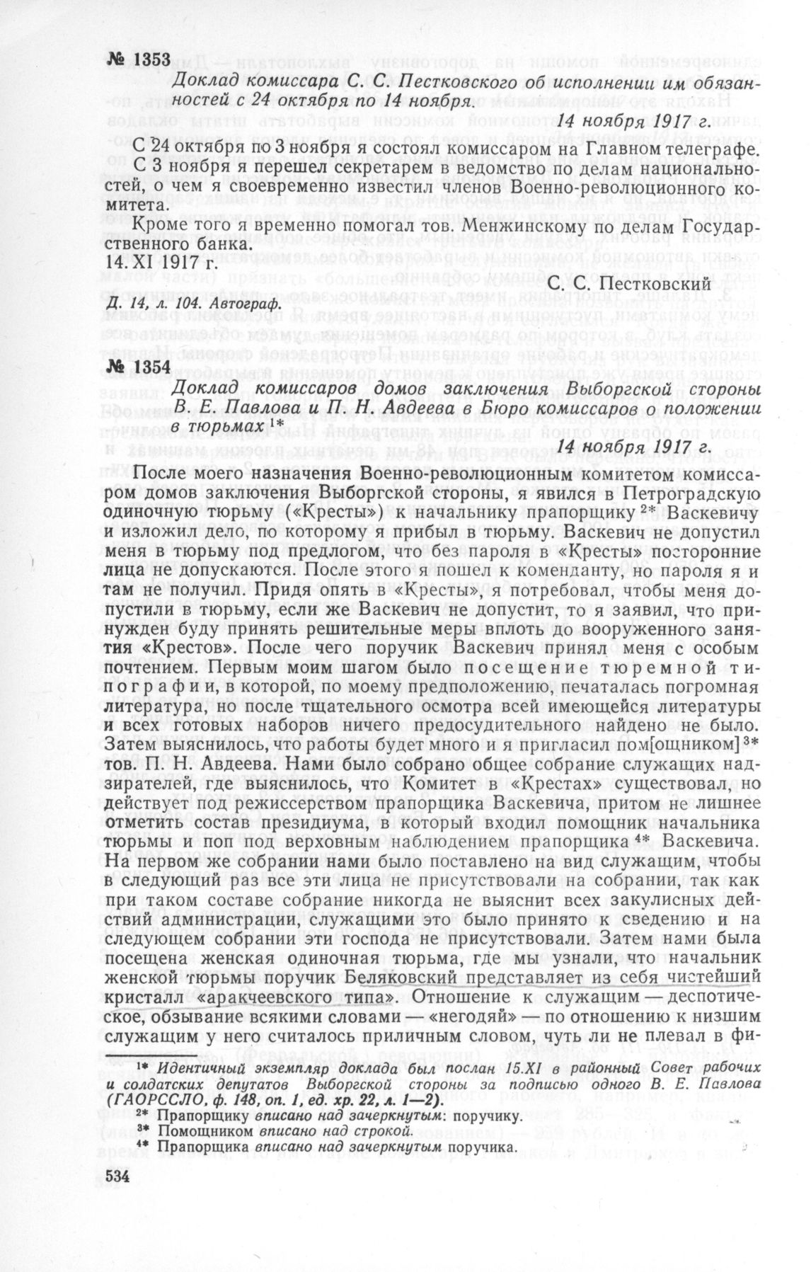 Доклад комиссаров домов заключения Выборгской стороны В. Е. Павлова и П. Н. Авдеева в Бюро комиссаров о положении в тюрьмах. 14 ноября 1917 г.