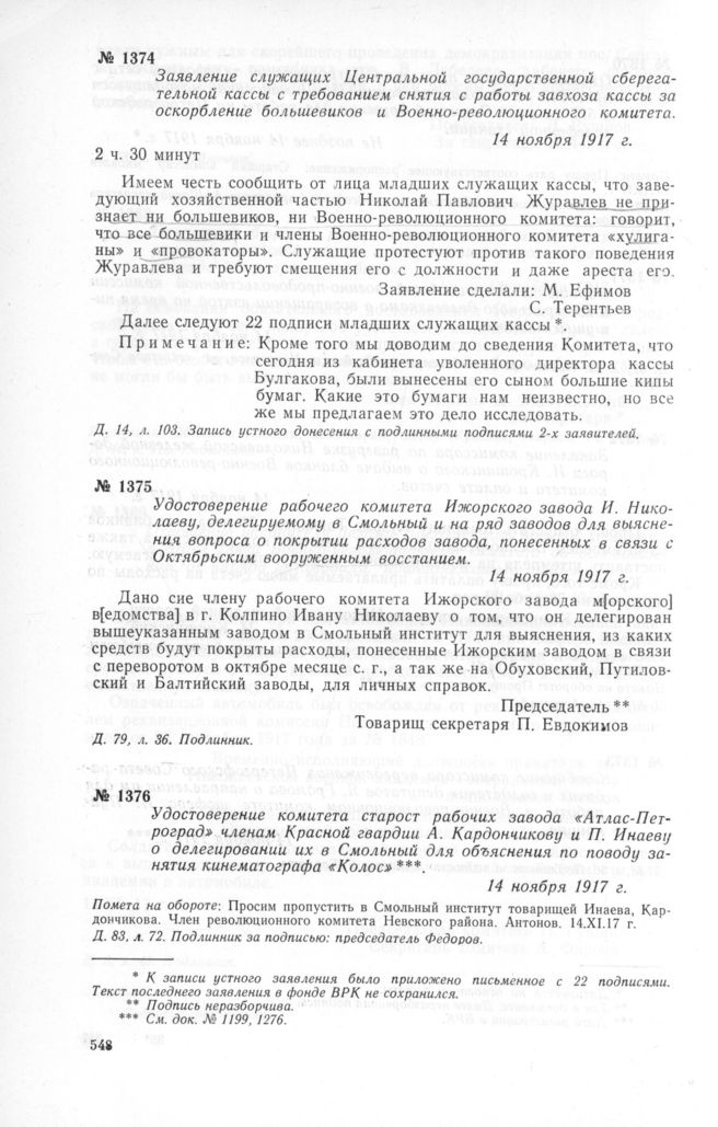 Удостоверение рабочего комитета Ижорского завода И. Николаеву, делегируемому в Смольный и на ряд заводов для выяснения вопроса о покрытии расходов завода, понесенных в связи с Октябрьским вооруженным восстанием. 14 ноября 1917 г. // Д. 79, л. 36. Подлинник.