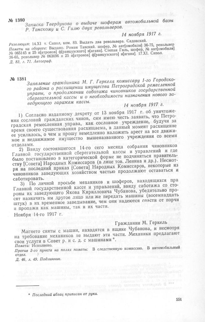 Заявление гражданина М. Г. Геркеля комиссару 1-го Городского района о расхищении имущества Петроградской ремесленной управы, о продолжении саботажа чиновников государственной сберегательной кассы и о необходимости назначения нового заведующего гаражем кассы. 14 ноября 1917 г.