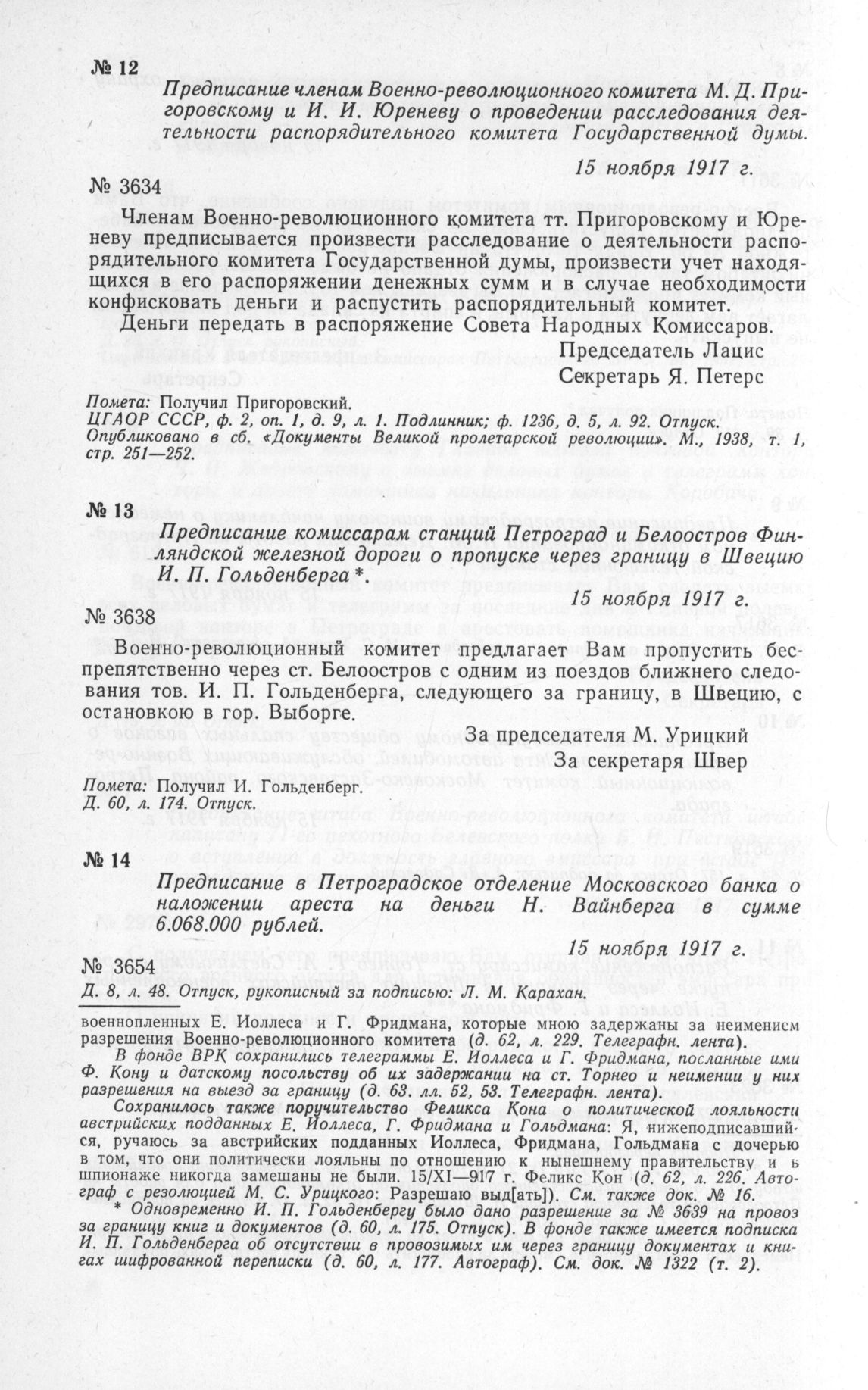Предписание членам Военно-революционного комитета М. Д. Пригоровскому и И. И. Юреневу о проведении расследования деятельности распорядительного комитета Государственной думы. 15 ноября 1917 г. // ЦГАОР СССР, ф. 2, оп. 1, д. 9, л. 1. Подлинник; ф. 1236, д. 5, л. 92. Отпуск. Опубликовано в сб. «Документы Великой пролетарской революции». М., 1938, т. 1, стр. 251-252.