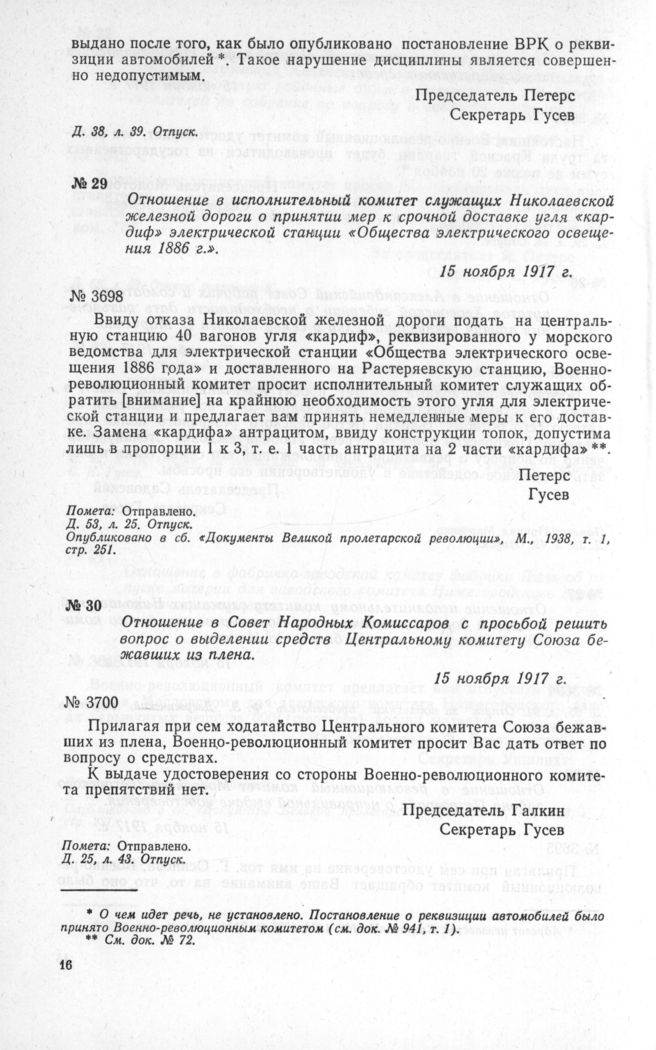 Отношение в исполнительный комитет служащих Николаевской железной дороги о принятии мер к срочной доставке угля «кардиф» электрической станции «Общества электрического освещения 1886 г.». 15 ноября 1917 г. // ЦГАОР СССР, ф. 1236, д. 53, л. 25. Отпуск. Опубликовано в сб. «Документы Великой пролетарской революции», М., 1938, т. 1, стр. 251.