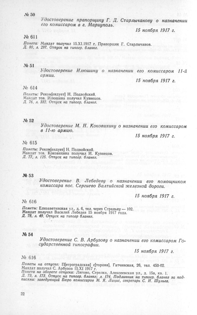 Удостоверение С. В. Арбузову о назначении его комиссаром Государственной типографии. 15 ноября 1917 г. // ЦГАОР СССР, ф. 1236, д. 73, л. 173. Отпуск на типогр. бланке; л. 174. Подлинник на типогр. бланке.