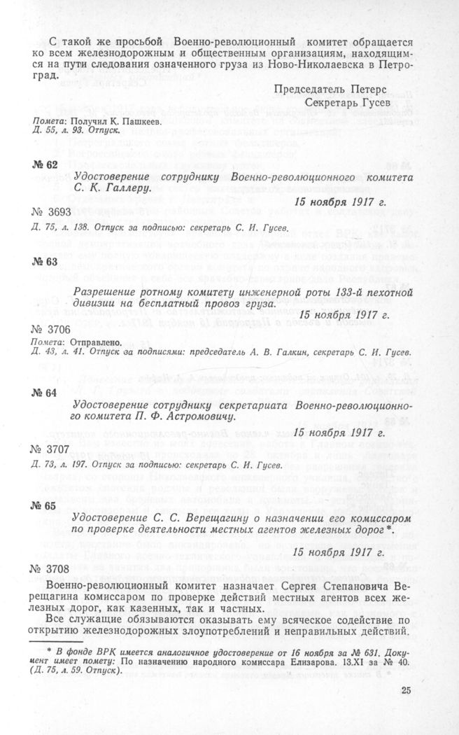 Удостоверение С. С. Верещагину о назначении его комиссаром по проверке деятельности местных агентов железных дорог. 15 ноября 1917 г. // ЦГАОР СССР, ф. 1236, д. 75, л. 58. Отпуск. Опубликовано в сб. «Документы Великой, пролетарской революции», М., 1938, т. 1, стр. 251.