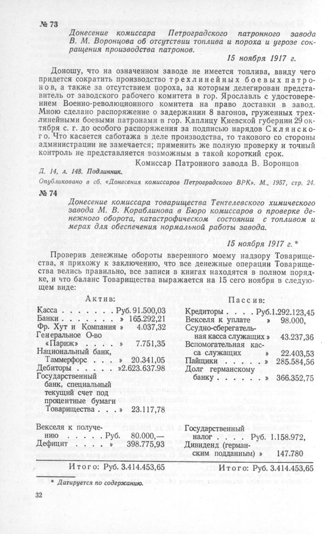 Донесение комиссара Петроградского патронного завода В. М. Воронцова об отсутствии топлива и пороха и угрозе сокращения производства патронов. 15 ноября 1917 г. // ЦГАОР СССР, ф. 1236, д. 14, л. 148. Подлинник. Опубликовано в сб. «Донесения комиссаров Петроградского Военно-революционного комитета». М., 1957, стр. 24.