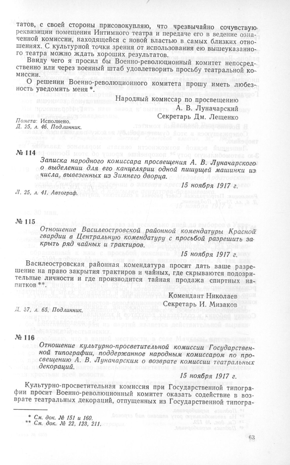 Отношение культурно-просветительной комиссии Государственной типографии, поддержанное народным комиссаром по просвещению А. В. Луначарским о возврате комиссии театральных декораций. 15 ноября 1917 г. // ЦГАОР СССР, ф. 1236, д. 6, лл. 73-74. Подлинник.
