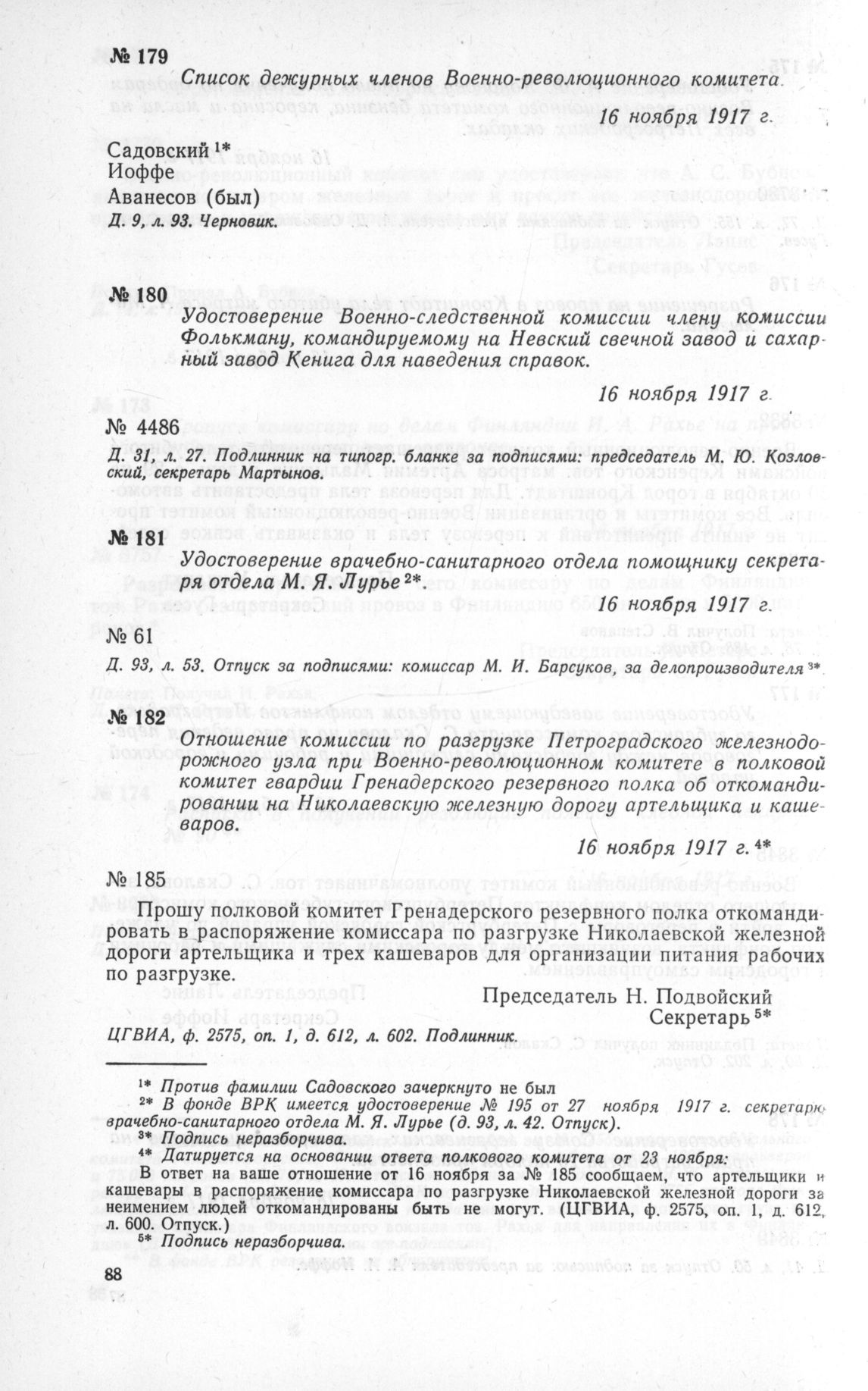 Отношение комиссии по разгрузке Петроградского железнодорожного узла при Военно-революционном комитете в полковой комитет гвардии Гренадерского резервного полка об откомандировании на Николаевскую железную дорогу артельщика и кашеваров. 16 ноября 1917 г. // ЦГВИА, ф. 2575, оп. 1, д. 612, л. 602. Подлинник.