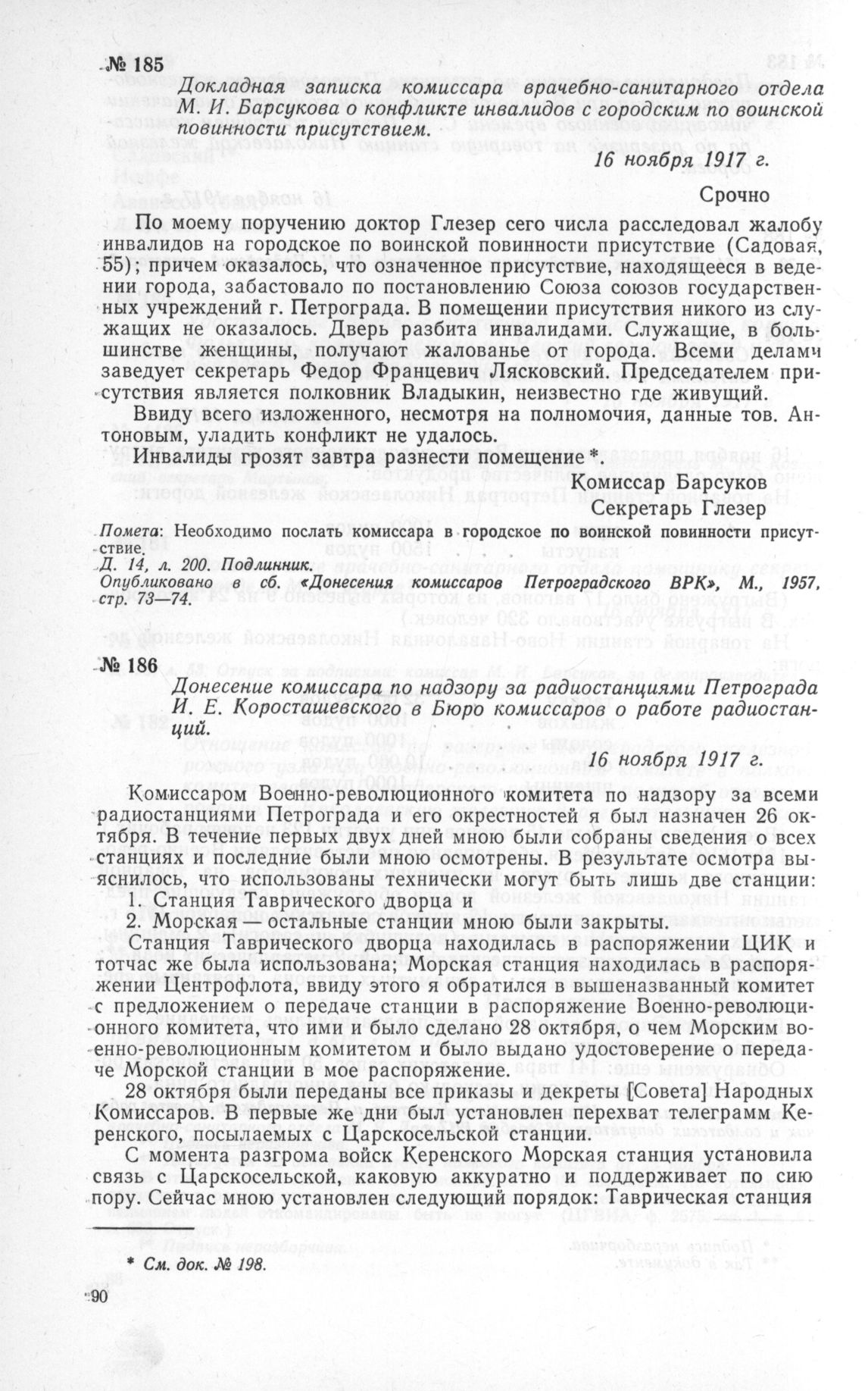 Докладная записка комиссара врачебно-санитарного отдела М. И. Барсукова о конфликте инвалидов с городским по воинской повинности присутствием. 16 ноября 1917 г. // ЦГАОР СССР, ф. 1236, д. 14, л. 200. Подлинник. Опубликовано в сб. «Донесения комиссаров Петроградского Военно-революционного комитета», М., 1957, стр. 73-74.