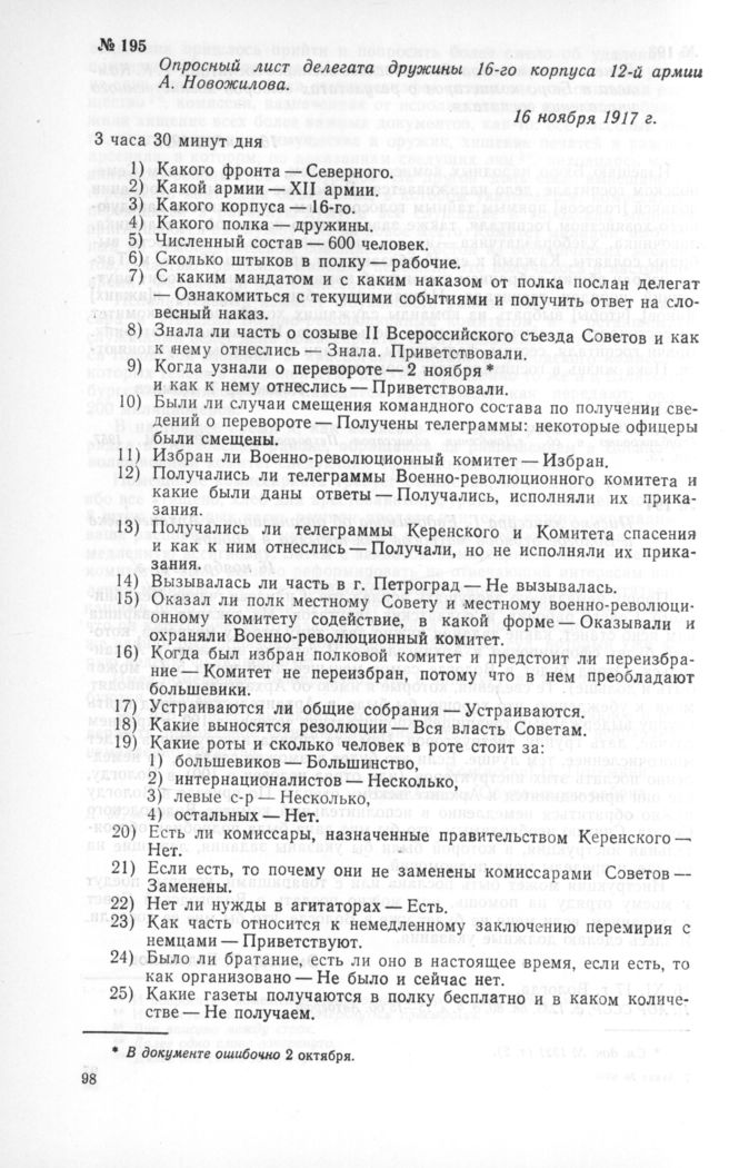 Опросный лист делегата дружины 16-го корпуса 12-й армии А. Новожилова. 16 ноября 1917 г. // ЦГАОР СССР, ф. 1236, д. 43, л. 43-43 об. Подлинник.