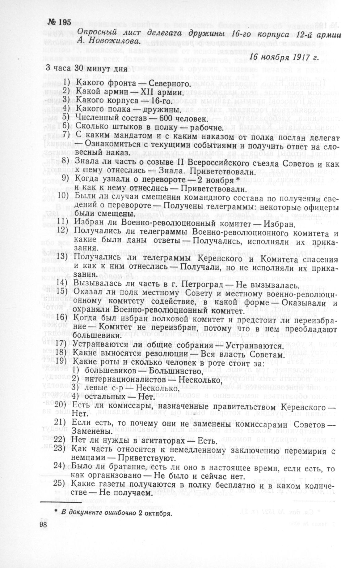 Опросный лист делегата дружины 16-го корпуса 12-й армии А. Новожилова. 16 ноября 1917 г.