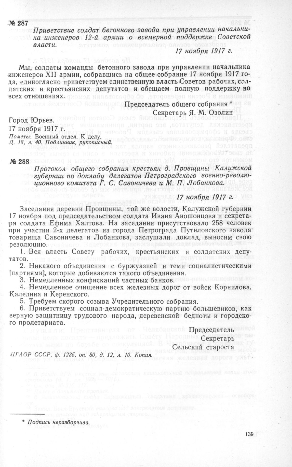 Приветствие солдат бетонного завода при управлении начальника инженеров 12-й армии о всемерной поддержке Советской власти. 17 ноября 1917 г. // ЦГАОР СССР, ф. 1236, д. 18, л. 40. Подлинник, рукописный.