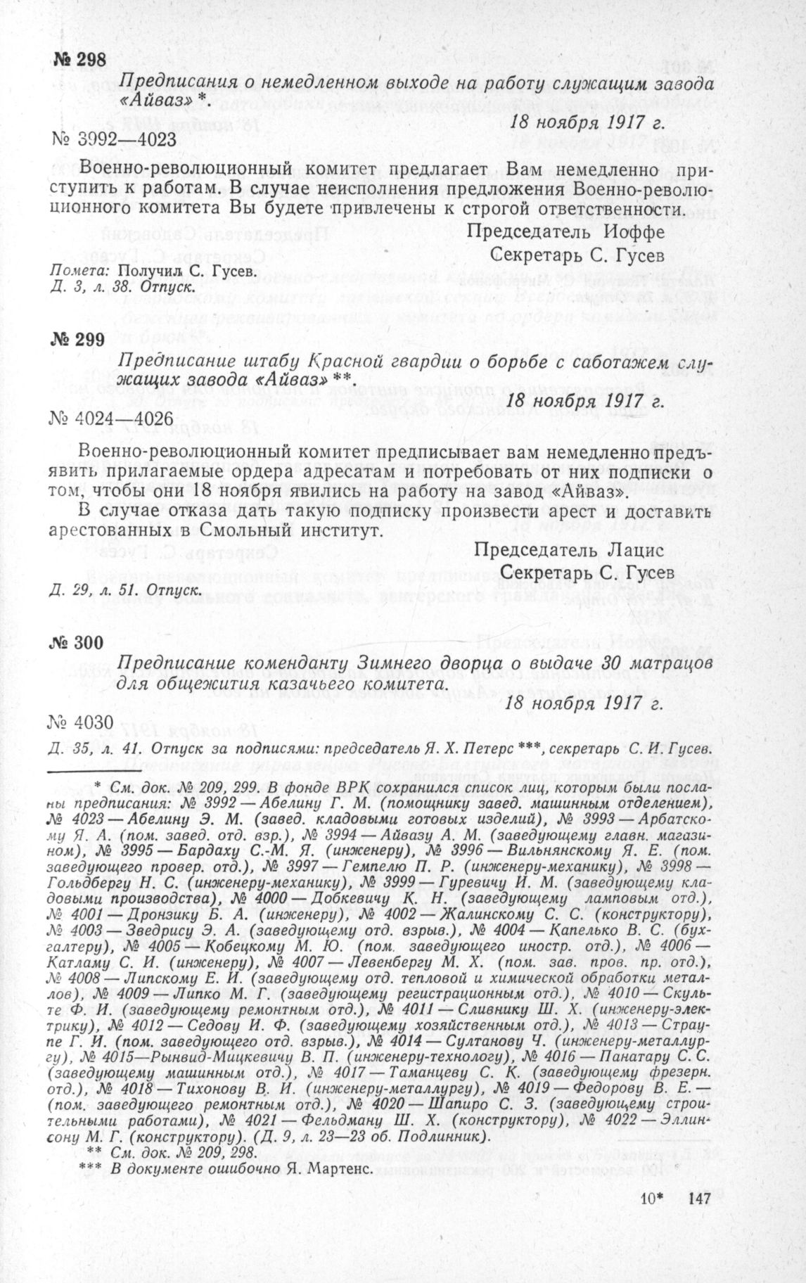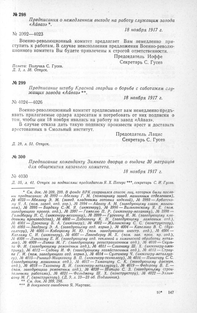 Предписание штабу Красной гвардии о борьбе с саботажем служащих завода «Айваз». 18 ноября 1917 г.