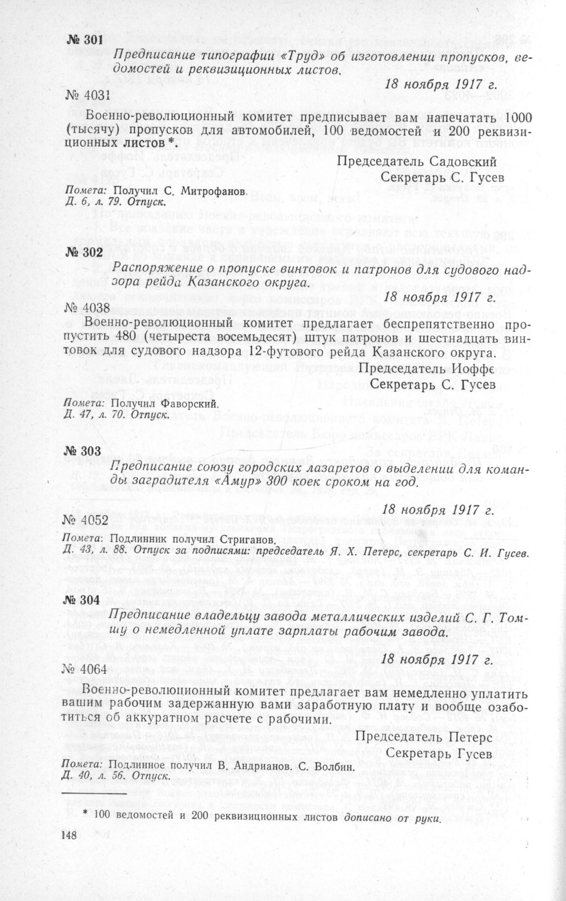 Предписание типографии «Труд» об изготовлении пропусков, ведомостей и реквизиционных листов. 18 ноября 1917 г.