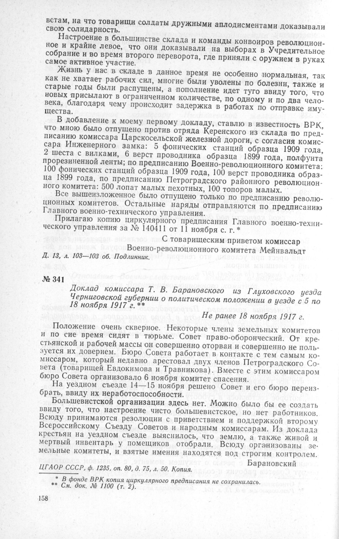 Доклад комиссара Т. В. Барановского из Глуховского уезда Черниговской губернии о политическом положении в уезде с 5 по 18 ноября 1917 г. Не ранее 18 ноября 1917 г. // ЦГАОР СССР, ф. 1235, оп. 80, д. 75, л. 50. Копия.