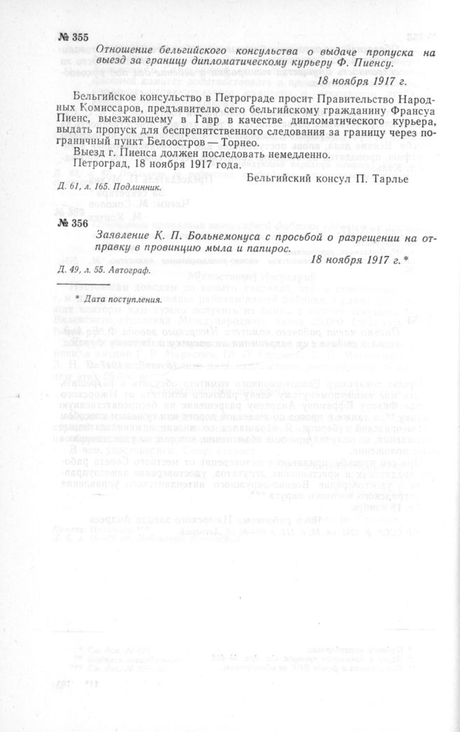 Заявление К. П. Больнемонуса с просьбой о разрешении на отправку в провинцию мыла и папирос. 18 ноября 1917 г. // ЦГАОР СССР, ф. 1236, д. 49, л. 55. Автограф.