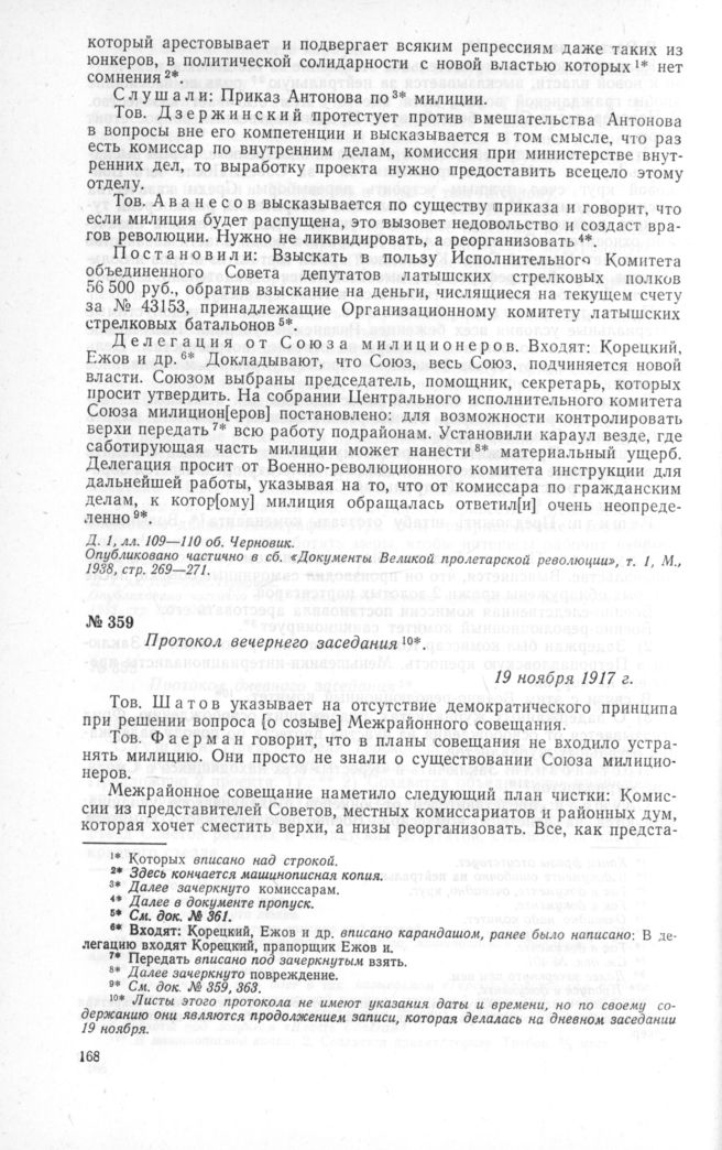 Протокол вечернего заседания. 19 ноября 1917 г. // ЦГАОР СССР, ф. 1236, д. 2, лл. 32-36. Черновик. Опубликовано частично в сб. «Документы Великой пролетарской революции», т. 1. М., 1938, стр. 271-275.