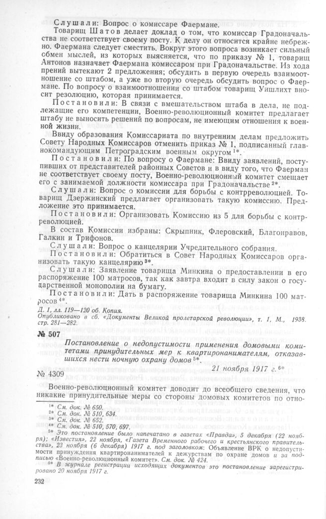 Постановление о недопустимости применения домовыми комитетами принудительных мер к квартиронанимателям, отказавшихся нести ночную охрану домов. 21 ноября 1917 г. // ЦГАОР СССР, ф. 1236, д. 3, л. 44. Отпуск. Опубликовано в сб. «Документы Великой пролетарской революции», т. 1, М., 1938, стр. 284.
