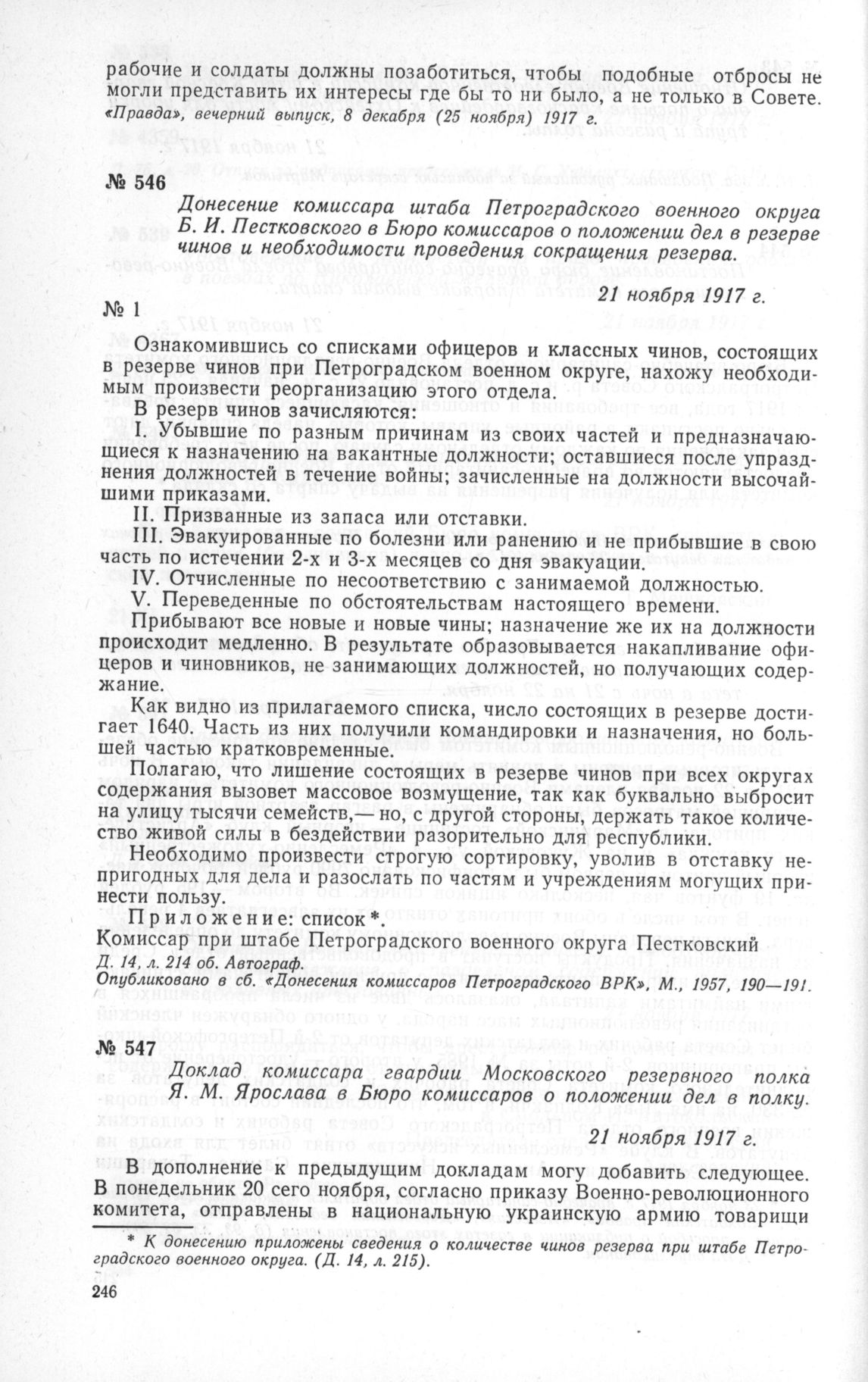 Донесение комиссара штаба Петроградского военного округа Б. И. Пестковского в Бюро комиссаров о положении дел в резерве чинов и необходимости проведения сокращения резерва. 21 ноября 1917 г. // ЦГАОР СССР, ф. 1236, д. 14, л. 214 об. Автограф. Опубликовано в сб. «Донесения комиссаров Петроградского Военно-революционного комитета», М., 1957, 190-191.