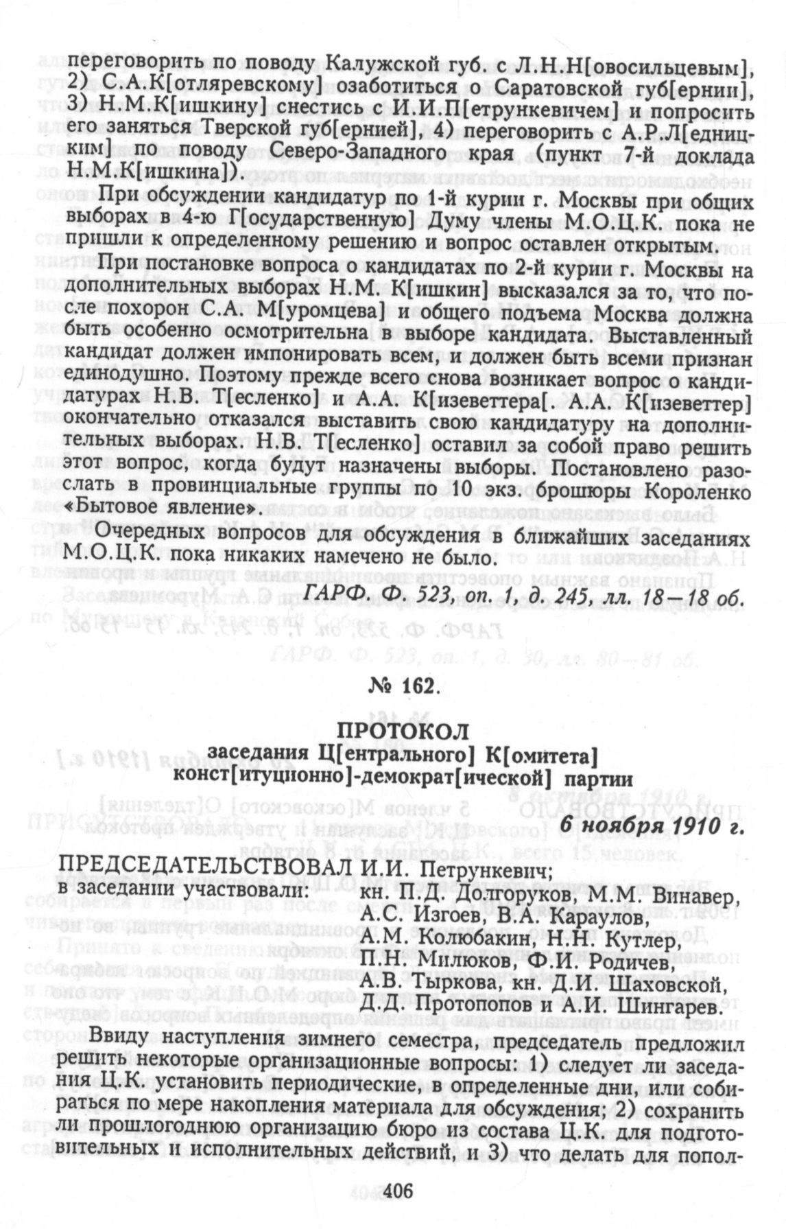 Протоколы Центрального Комитета конституционно-демократической партии. Протокол заседания Ц[ентрального] К[омитета] конст[итуционно]-демократ[ической] партии. 6 ноября 1910 г.