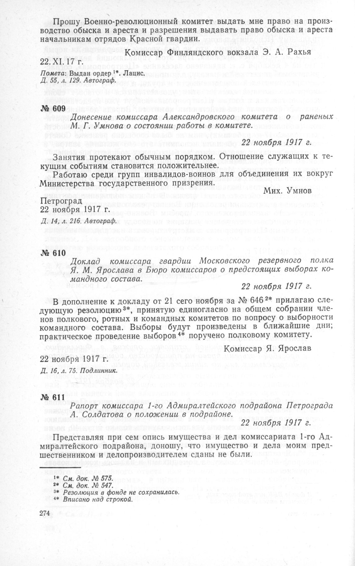 Рапорт комиссара 1-го Адмиралтейского подрайона Петрограда А. Солдатова о положении в подрайоне. 22 ноября 1917 г. // ЦГАОР СССР, ф. 1236, д. 80, л. 249. Подлинник.