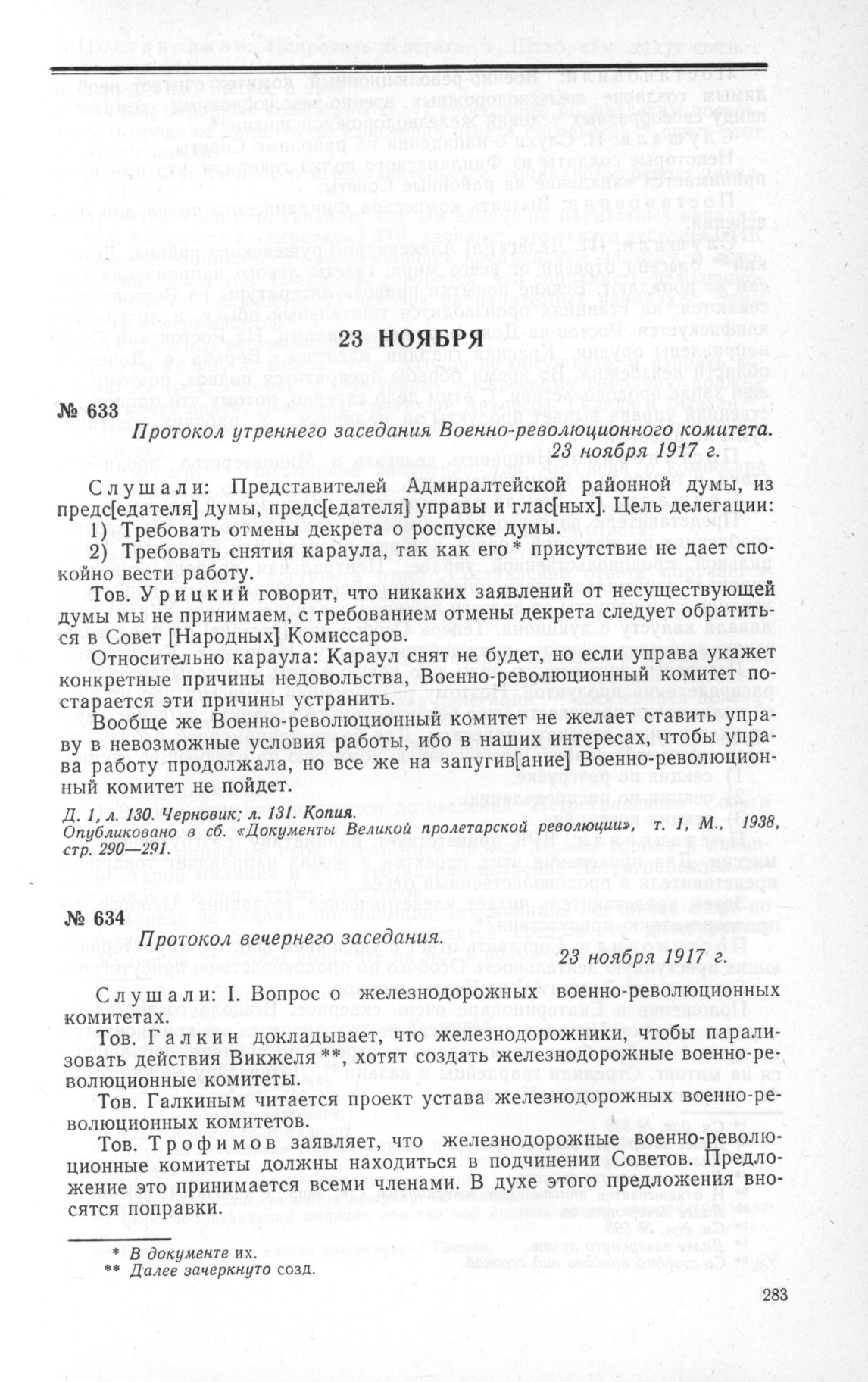 Протокол вечернего заседания. 23 ноября 1917 г. // ЦГАОР СССР, ф. 1236, д. 1, лл. 132-134 об. Черновик; лл. 135-137. Копия. Опубликовано частично в сб. «Документы Великой пролетарской революции», т. 1. М., 1938, стр. 291-293.
