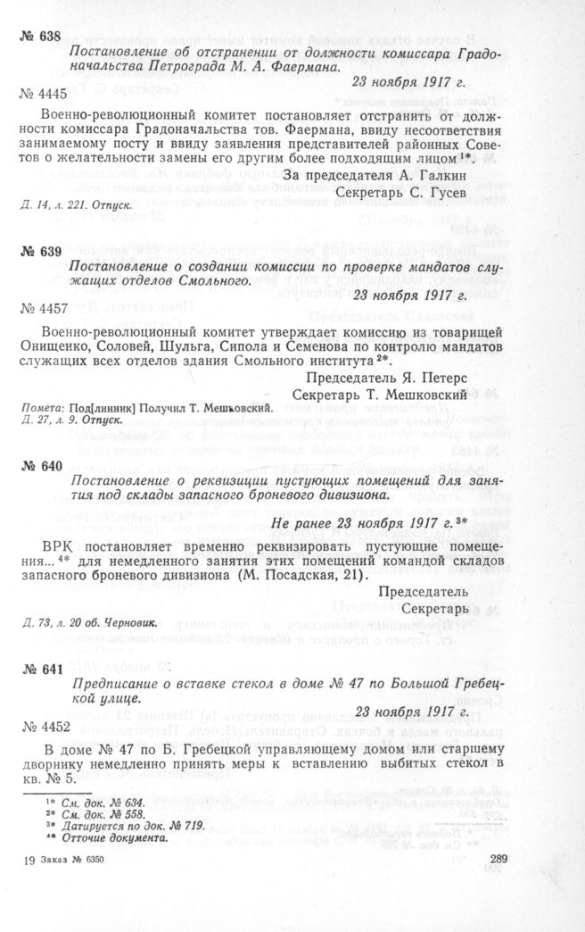 Постановление о создании комиссии по проверке мандатов служащих отделов Смольного. 23 ноября 1917 г.