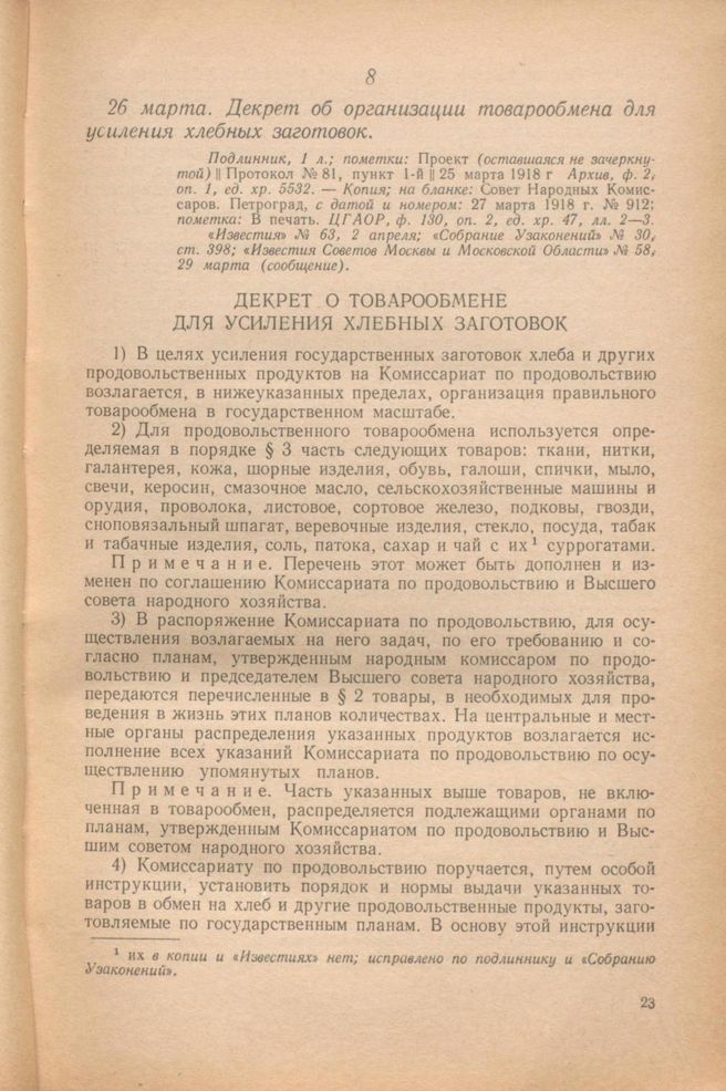 26 марта. Декрет об организации товарообмена для усиления хлебных заготовок // Подлинник, 1 л.; пометки: Проект (оставшаяся не зачеркнутой) || Протокол № 81, пункт 1- || 25 марта 1918 г Архив, ф.2, оп. 1, ед. хр. 5532. — Копия; на бланке: Совет Народных Комиссаров. Петроград, с датой и номером: 27 марта 1918 г. № 912; пометка: В печать. ЦГАОР, ф. 130, оп. 2, ед. хр. 47, лл. 2—3. «Известия» № 63, 2 апреля; «Собрание Узаконений» № 30, ст. 398; «Известия Советов Москвы и Московской Области» № 58, 29 марта (сообщение).