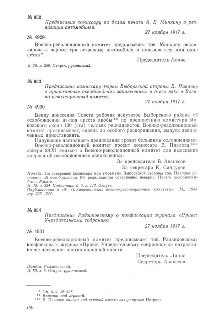 Петроградский Военно-революционный комитет: Док. и материалы в 3 т. Т. 3. — М.: Наука, 1967.
