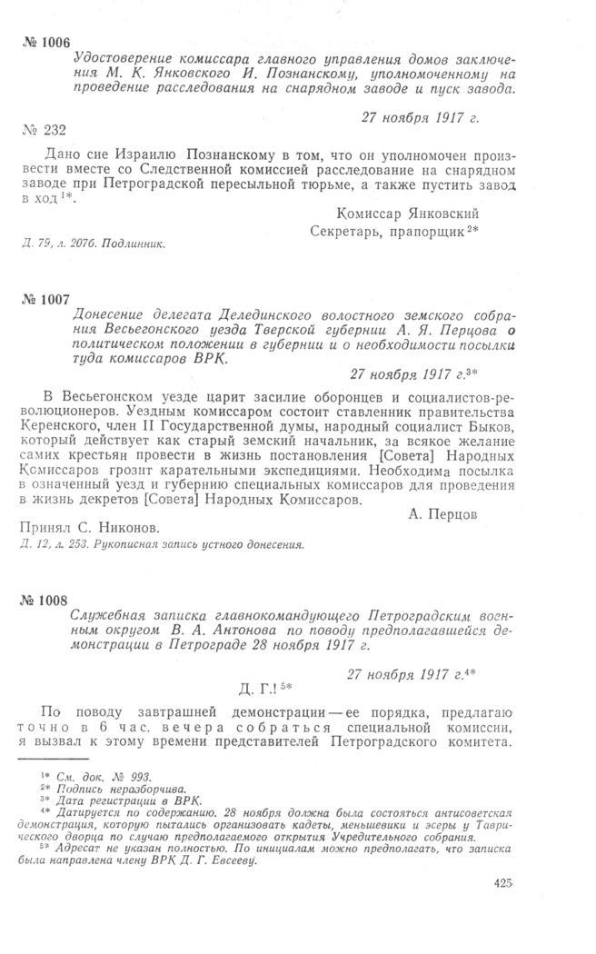 Донесение делегата Делединского волостного земского собрания Весьегонского уезда Тверской губернии А. Я. Перцова о политическом положении в губернии и о необходимости посылки туда комиссаров ВРК. 27 ноября 1917 г. // ЦГАОР СССР, ф. 1236, д. 12, л. 253. Рукописная запись устного донесения.
