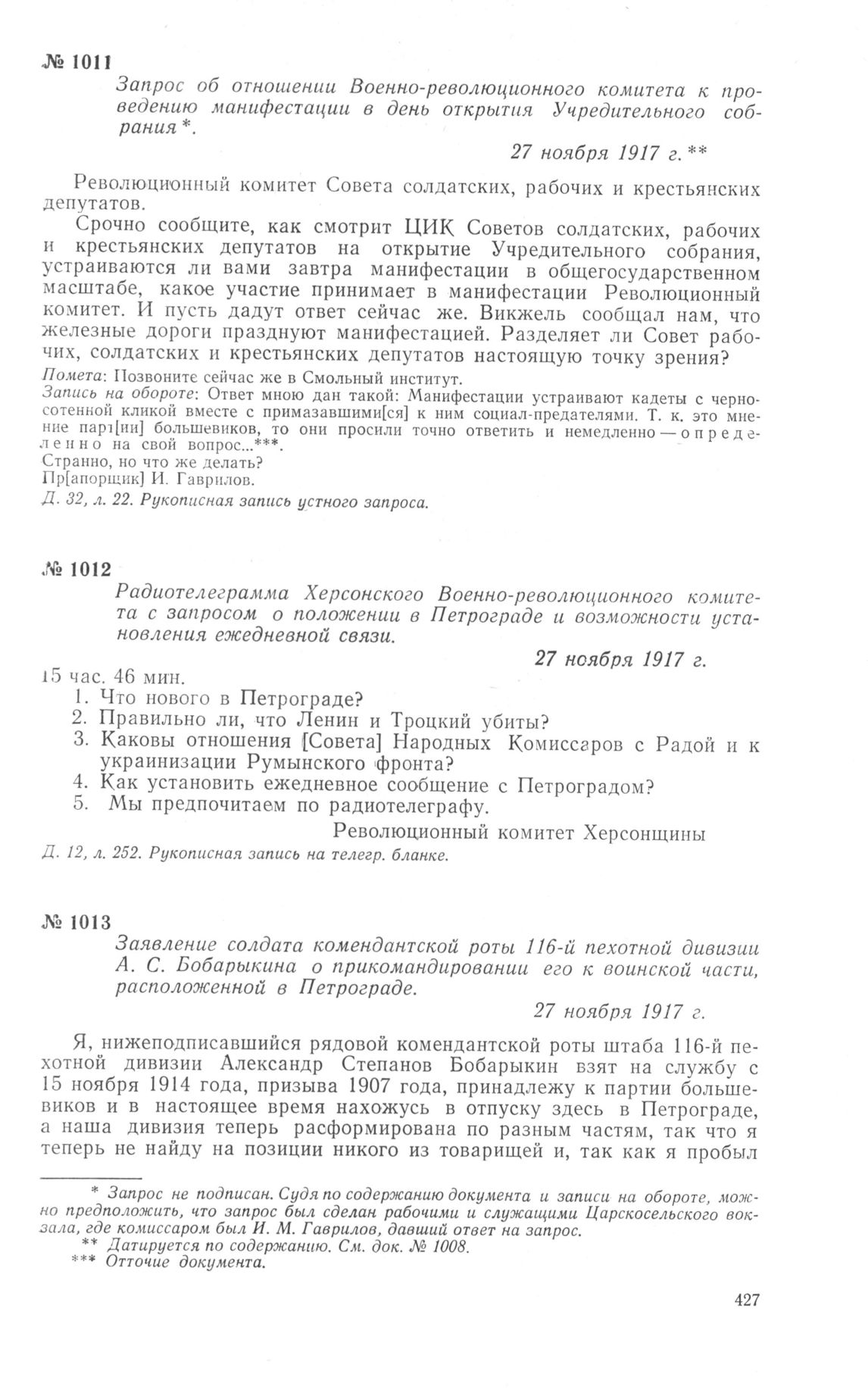 Запрос об отношении Военно-революционного комитета к проведению манифестации в день открытия Учредительного собрания. 27 ноября 1917 г. // ЦГАОР СССР, ф. 1236, д. 32, л. 22. Рукописная запись устного запроса.