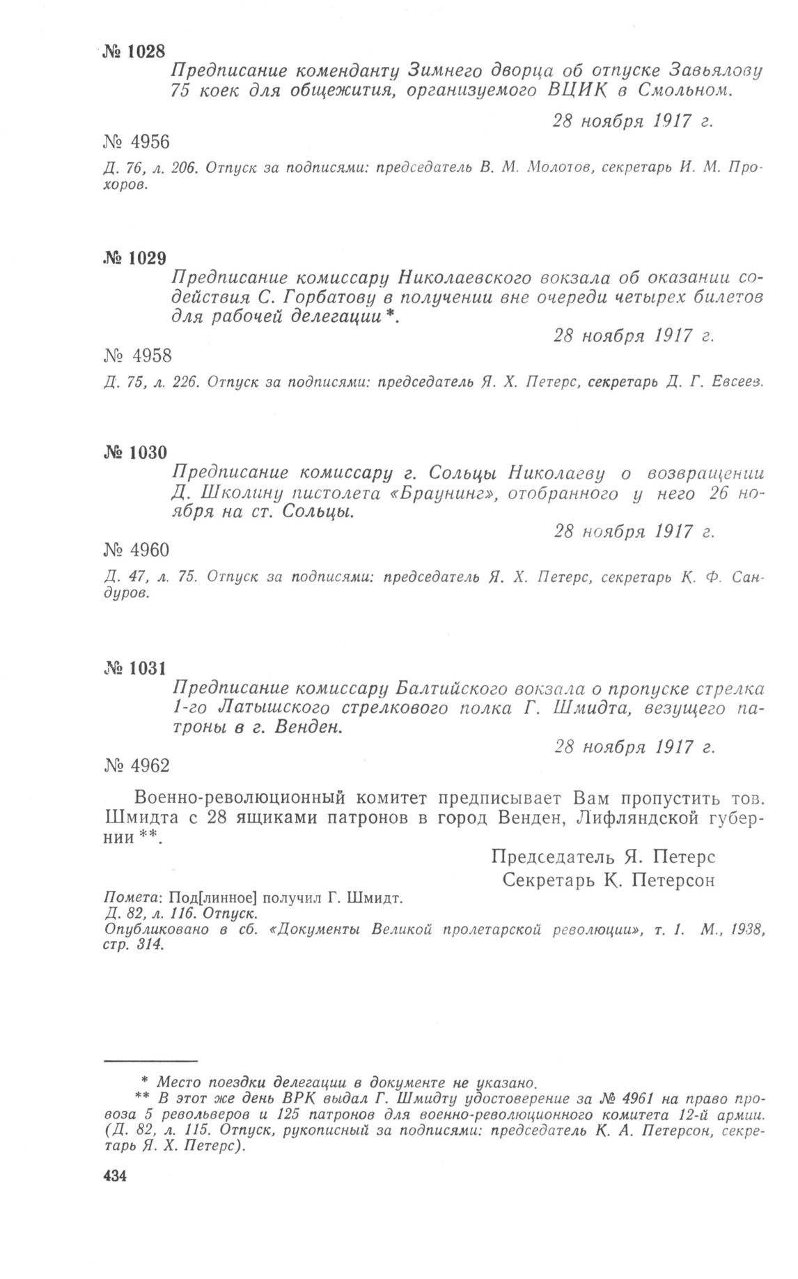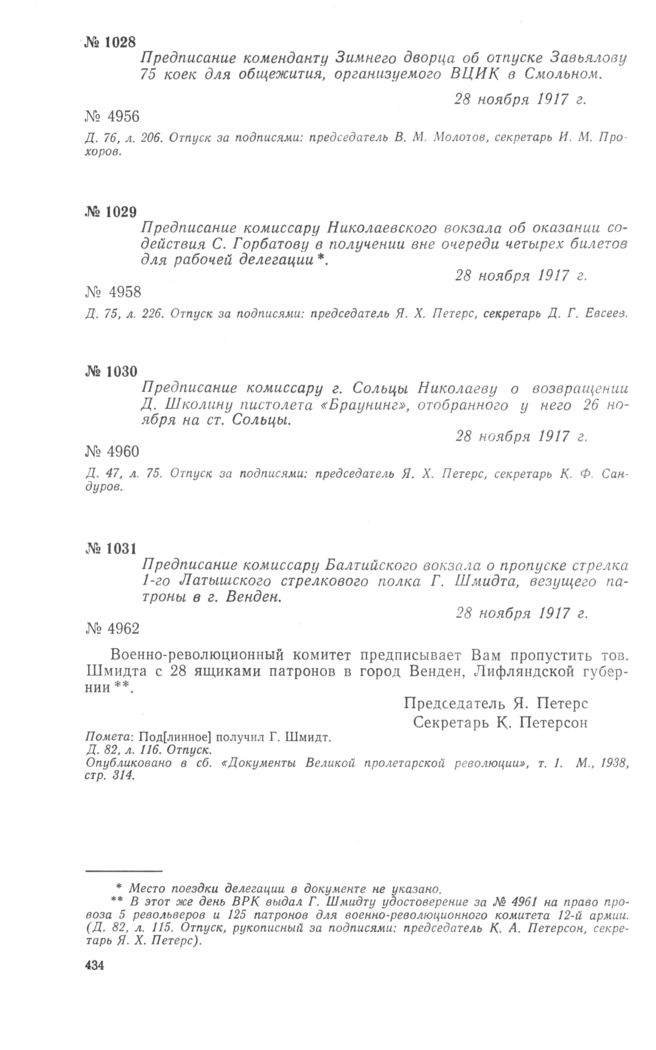 Предписание комиссару Николаевского вокзала об оказании содействия С. Горбатову в получении вне очереди четырех билетов для рабочей делегации. 28 ноября 1917 г. // ЦГАОР СССР, ф. 1236, д. 75, л. 226. Отпуск.