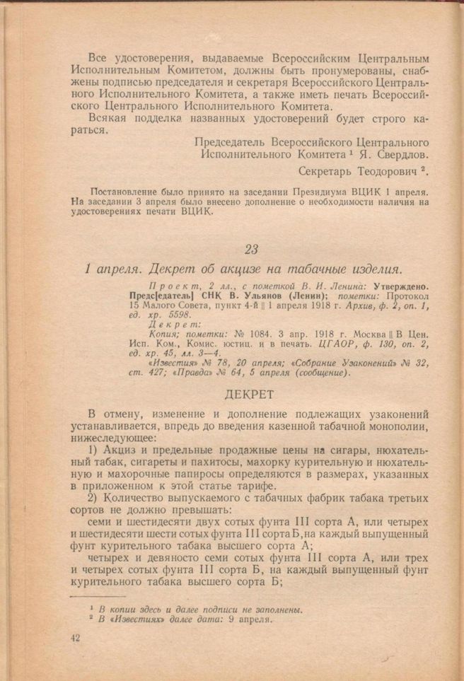 1 апреля. Декрет об акцизе на табачные изделия // Проект, 2 лл., с пометкой В. И. Ленина: Утверждено. Председатель СНК В. Ульянов (Ленин); пометки: Протокол 15 Малого Совета, пункт 4-й || 1 апреля 1918 г. Архив, ф. 2, оп. 1, ед. хр. 5598. Декрет: Копия; пометки: № 1084. 3 апр. 1918 г. Москва || В Цен. Исп. Ком., Комис. юстиц. и в печать. ЦГАОР, ф. 130, оп. 2, ед. хр. 45, лл. 3—4. «Известия» № 78, 20 апреля; «Собрание Узаконений» № 32, ст. 427; «Правда» № 64, 5 апреля (сообщение).