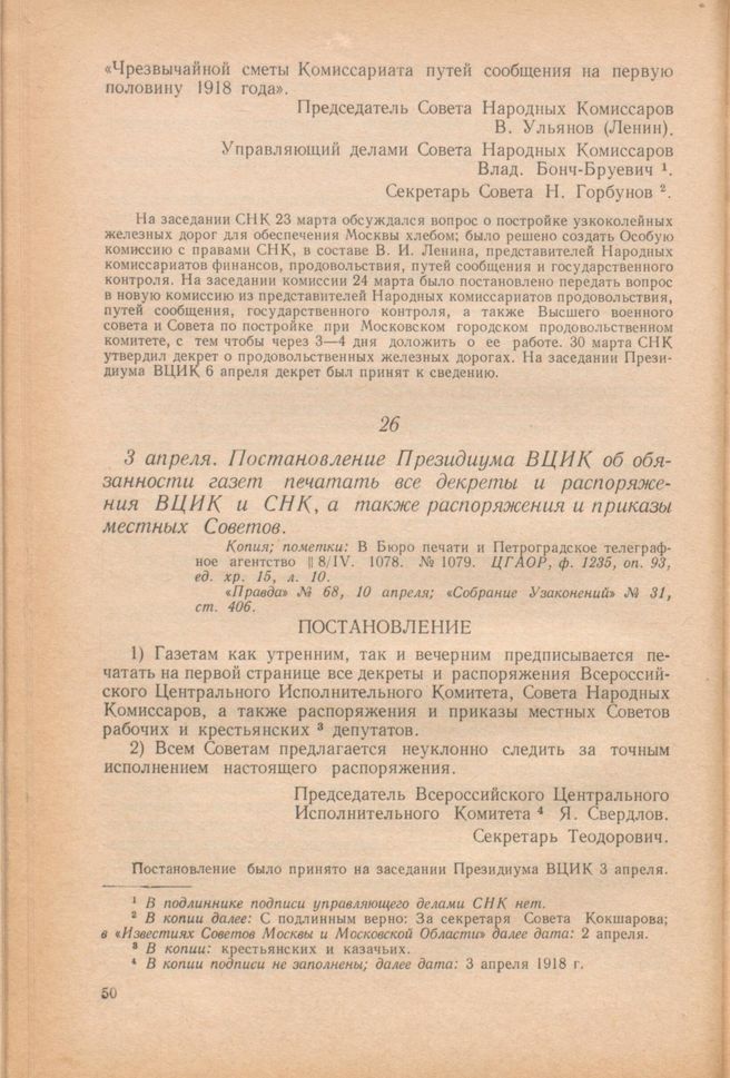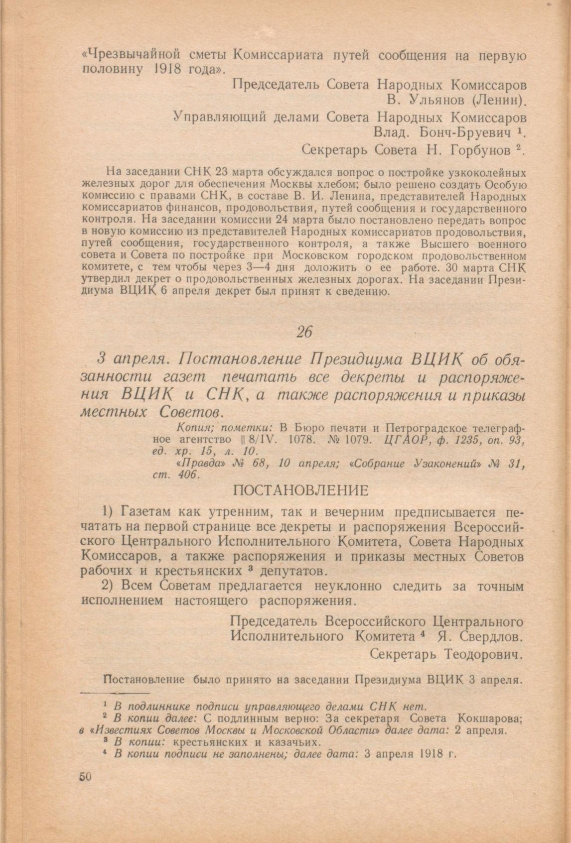 Главная Серия «Экономическая история. Документы, исследования, переводы» Декреты советской власти в 18 т. Декреты Советской власти. Т. II. 17 марта - 10 июля 1918 г. Документы 3 апреля. Постановление Президиума ВЦИК об обязанности газет печата...