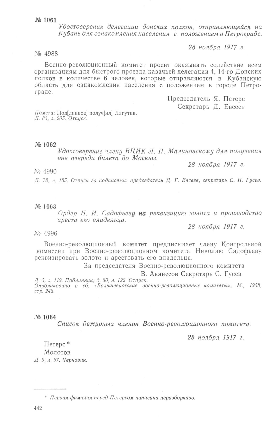 Ордер Н. И. Садофьеву на реквизицию золота и производство ареста его владельца. 28 ноября 1917 г. // ЦГАОР СССР, ф. 1236, д. 5, л. 119. Подлинник; д. 80, л. 122. Отпуск. Опубликовано в сб. «Большевистские военно-революционные комитеты», М., 1958, стр. 248.