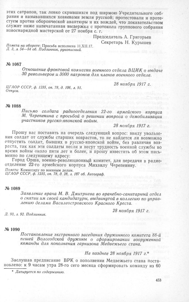 Постановление экстренного заседания дружинного комитета 88-й пешей Вологодской дружины о сформировании вооруженной команды для пополнения гарнизона Медвежьего стана. Не позднее 28 ноября 1917 г. // ЦГАОР СССР, ф. 1236, д. 16, л 252. Заверенная копия.