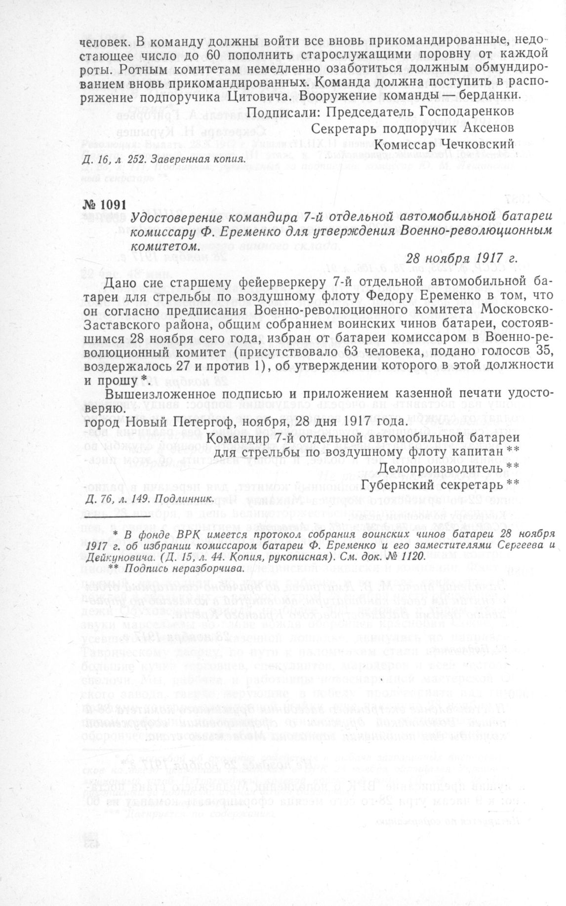 Удостоверение командира 7-й отдельной автомобильной батареи комиссару Ф. Еременко для утверждения Военно-революционным комитетом. 28 ноября 1917 г. // ЦГАОР СССР, ф. 1236, д. 76, л. 149. Подлинник.
