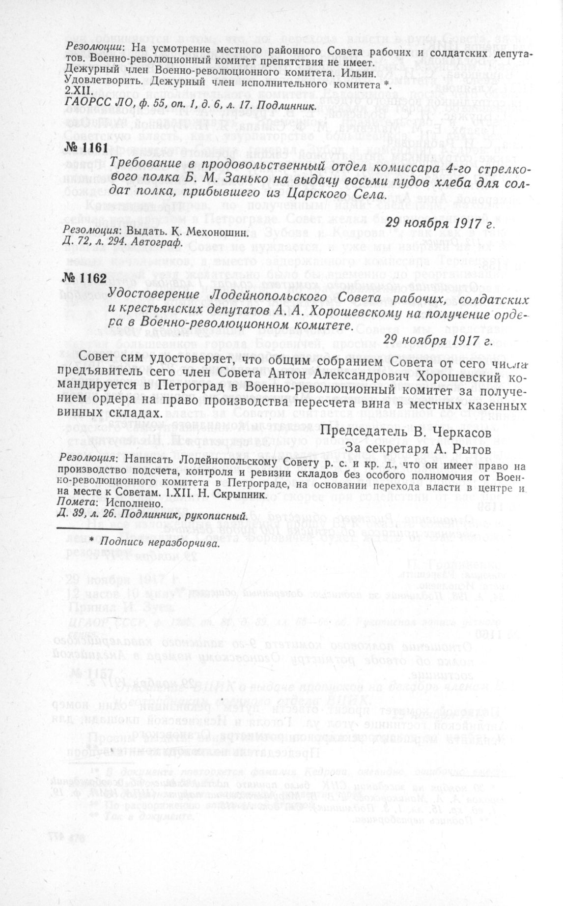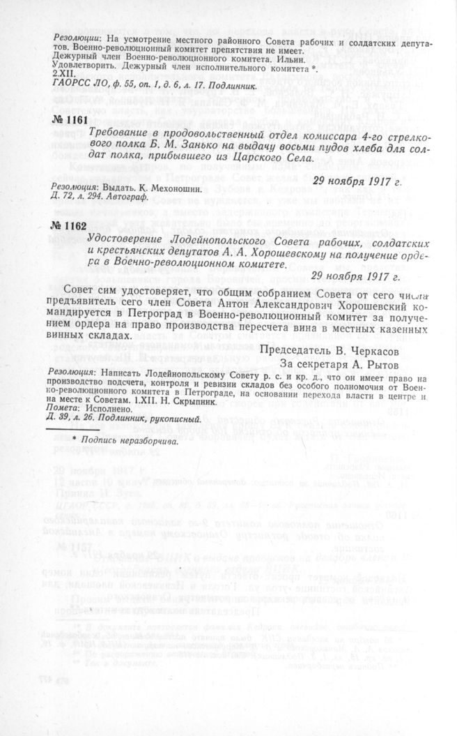 Требование в продовольственный отдел комиссара 4-го стрелкового полка Б. М. Занько на выдачу восьми пудов хлеба для солдат полка, прибывшего из Царского Села. 29 ноября 1917 г. // ЦГАОР СССР, ф. 1236, д. 72, л. 294. Автограф.