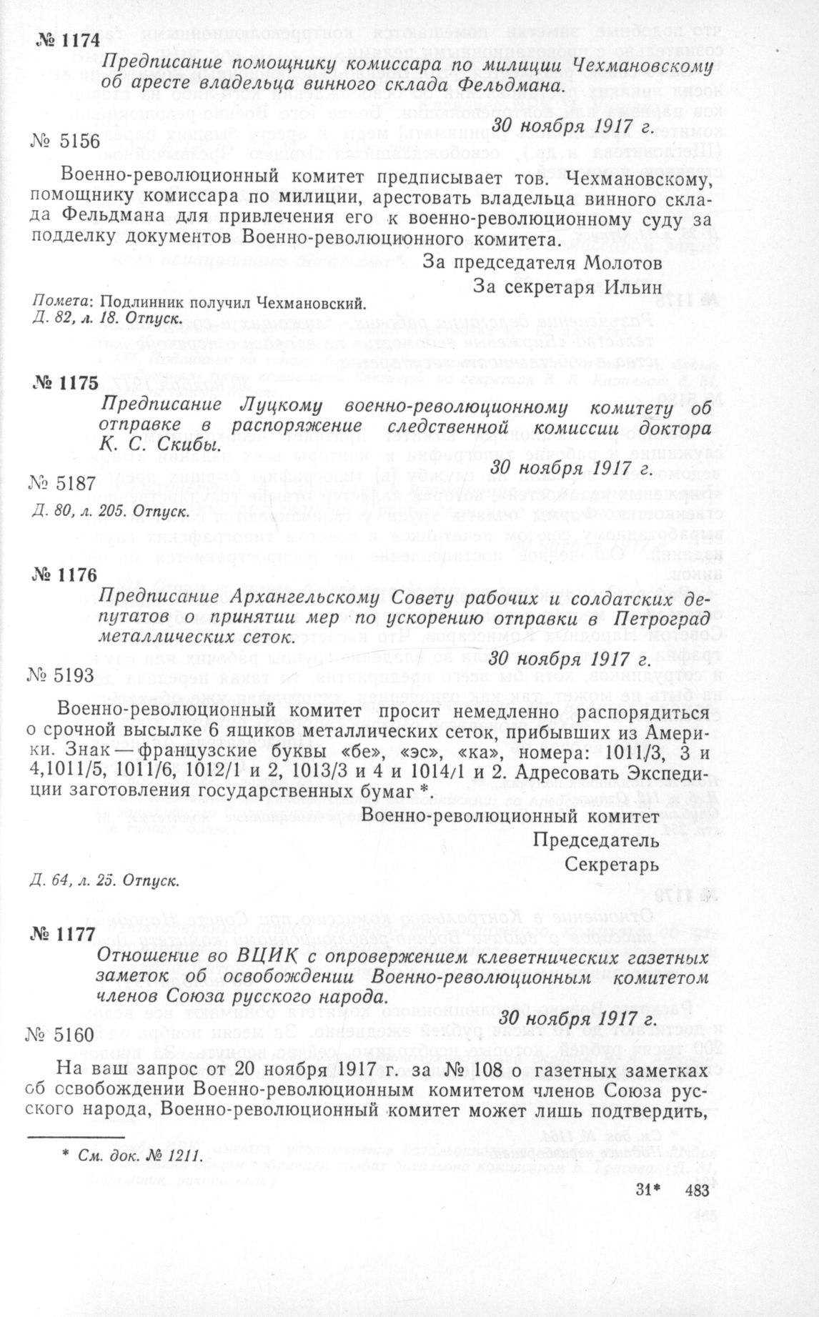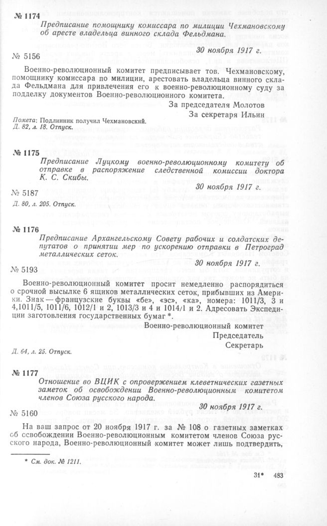 Предписание Луцкому военно-революционному комитету об отправке в распоряжение следственной комиссии доктора К. С. Скибы. 30 ноября 1917 г. // ЦГАОР СССР, ф. 1236, д. 80, л. 205. Отпуск.