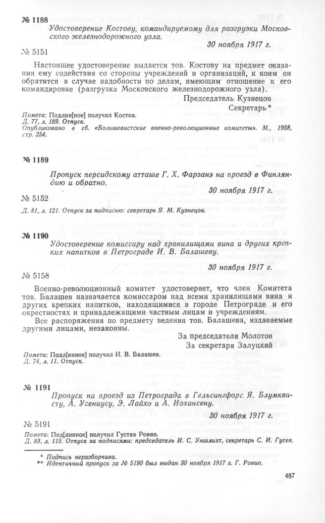 Пропуск на проезд из Петрограда в Гельсингфорс Я. Блумквисту, А. Усениусу, Э. Лайхо и А. Йохансену. 30 ноября 1917 г. // ЦГАОР СССР, ф. 1236, д. 83, л. 115. Отпуск.
