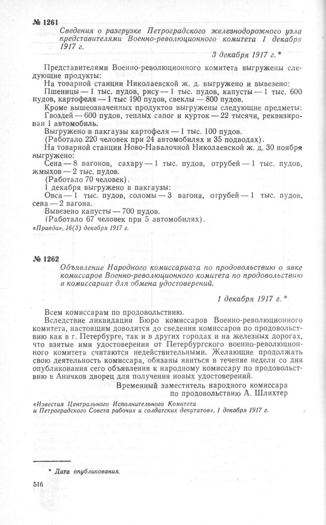 Объявление Народного комиссариата по продовольствию о явке комиссаров Военно-революционного комитета по продовольствию в комиссариат для обмена удостоверений. 1 декабря 1917 г. // «Известия Центрального Исполнительного Комитета и Петроградского Совета рабочих и солдатских депутатов», 1 декабря 1917 г.