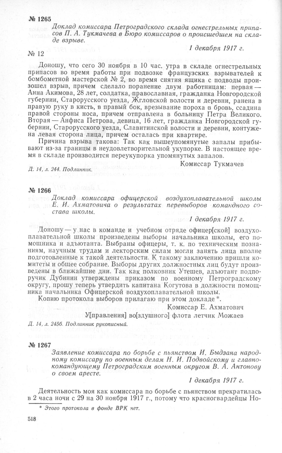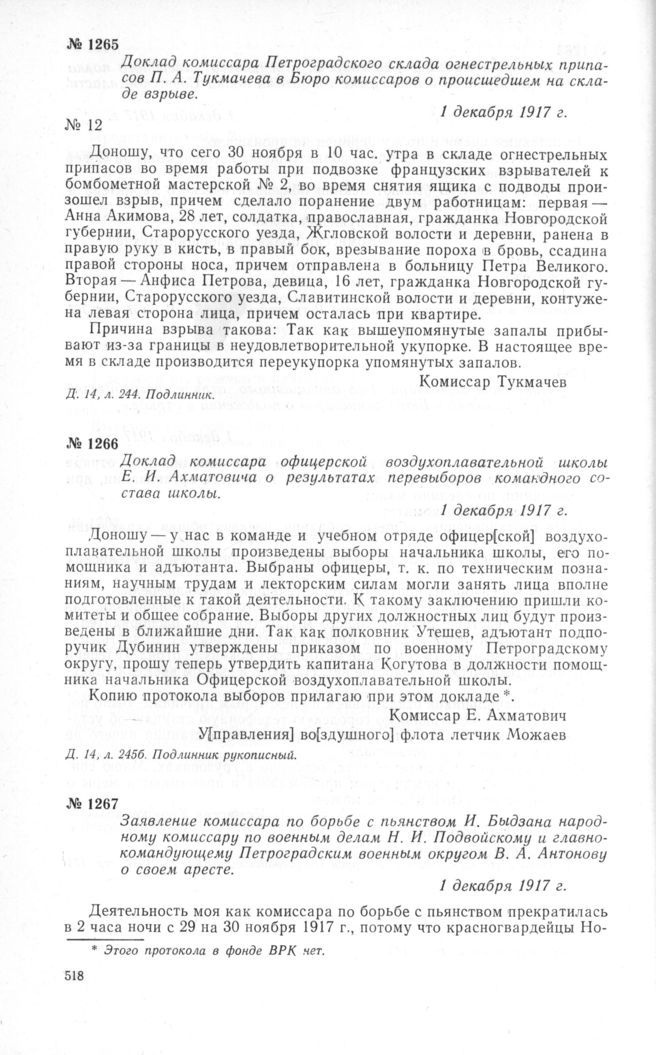 Заявление комиссара по борьбе с пьянством И. Быдзана народному комиссару по военным делам Н. И. Подвойскому и главнокомандующему Петроградским военным округом В. А. Антонову о своем аресте. 1 декабря 1917 г.