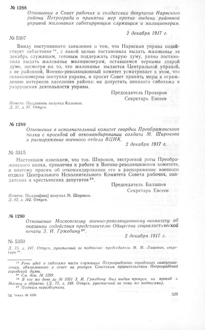 Отношение Московскому военно-революционному комитету об оказании содействия представителю Общества социалистической печати 3. И. Гржебину. 2 декабря 1917 г. // ЦГАОР СССР, ф. 1236, д. 75, л. 247. Отпуск, рукописный.