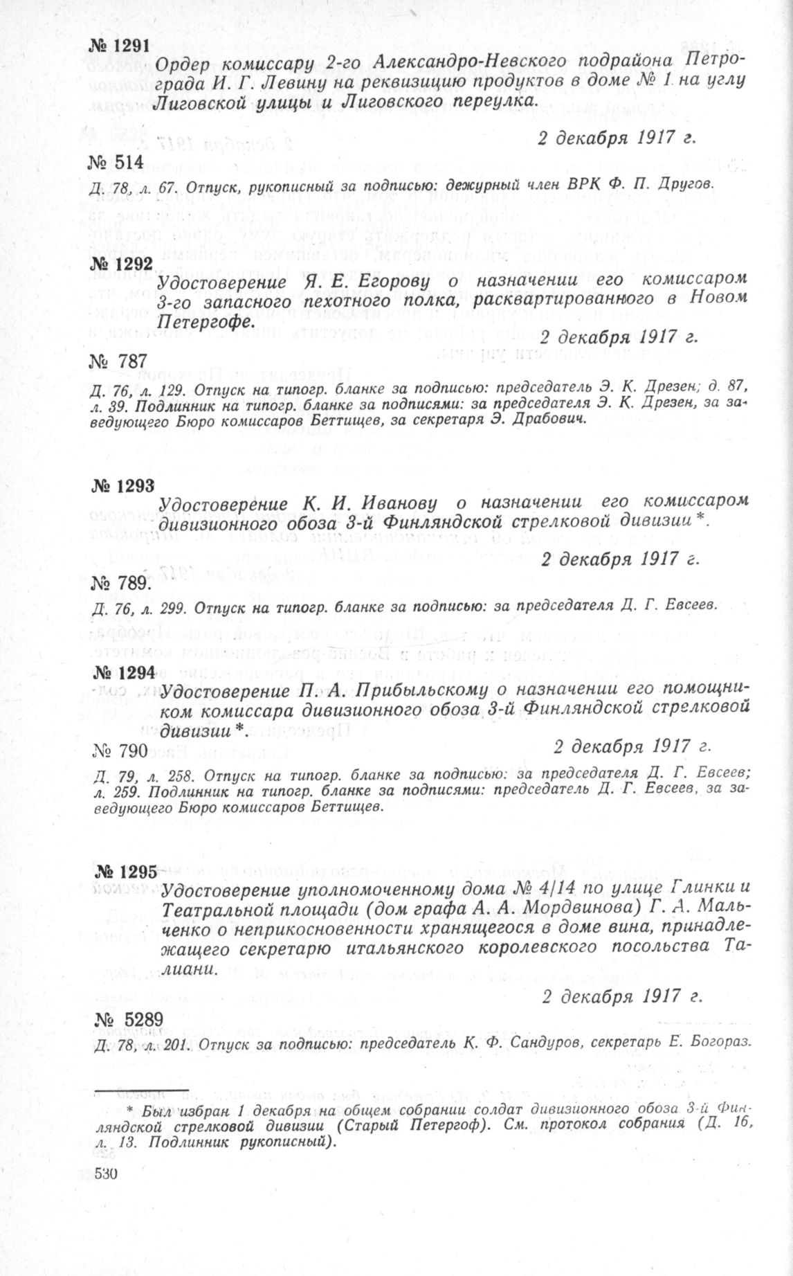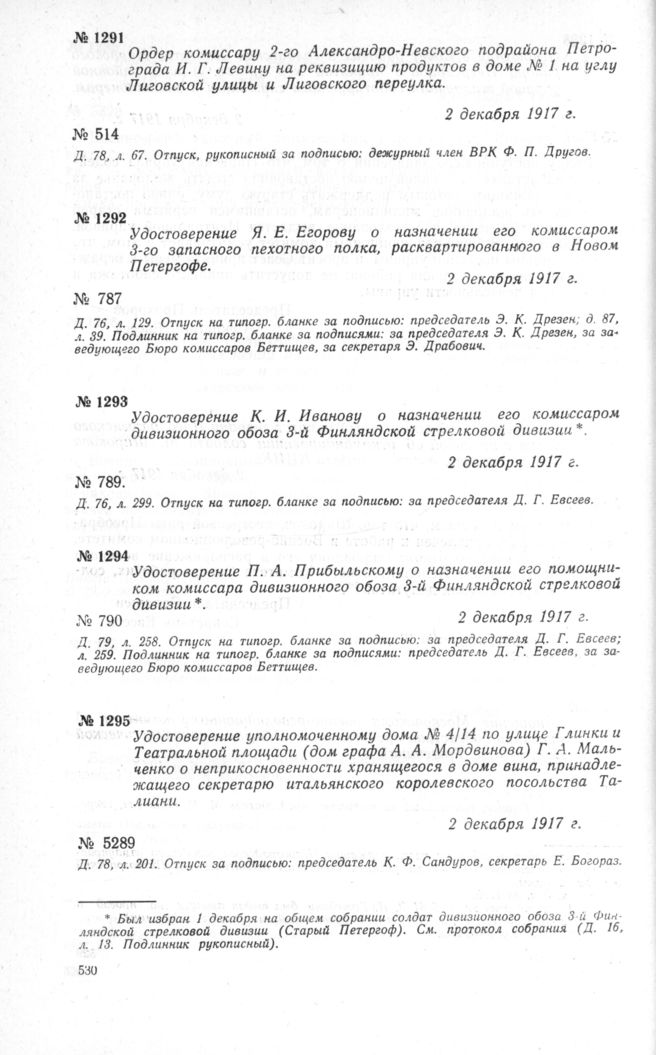 Удостоверение К. И. Иванову о назначении его комиссаром дивизионного обоза 3-й Финляндской стрелковой дивизии. 2 декабря 1917 г. // ЦГАОР СССР, ф. 1236, д. 76, л. 299. Отпуск на типогр. бланке.