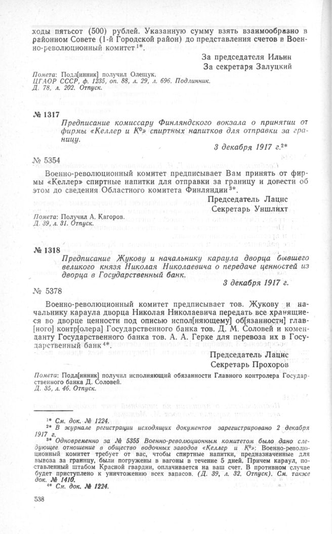 Предписание комиссару Финляндского вокзала о принятии от фирмы «Келлер и К°» спиртных напитков для отправки за границу. 3 декабря 1917 г. // ЦГАОР СССР, ф. 1236, д. 39, л. 31. Отпуск.