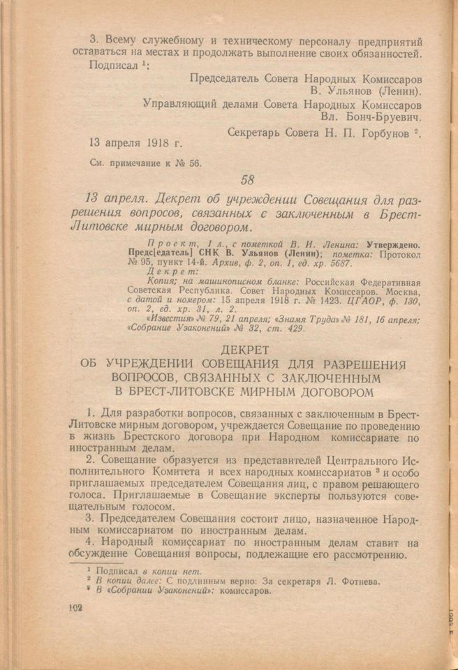 13 апреля. Декрет об учреждении Совещания для разрешения вопросов, связанных с заключенным в Брест-Литовске мирным договором // Проект, 1 л., с пометкой В. И. Ленина: Утверждено. Председатель СНК В. Ульянов (Ленин); пометка: Протокол № 95, пункт 14-й. Архив, ф. 2, оп. 1, ед. хр. 5687. Декрет: Копия; на машинописном бланке: Российская Федеративная Советская Республика. Совет Народных Комиссаров. Москва, с датой и номером: 15 апреля 1918 г. № 1423. ЦГАОР, ф. 130, оп. 2, ед. хр. 31, л. 2. «Известия» № 79, 21 апреля; «Знамя Труда» № 181, 16 апреля; «Собрание Узаконений» № 32, ст. 429.